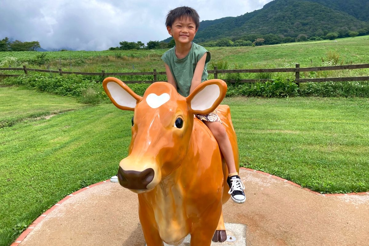 自然豊かな景色を背景に、こんな風に可愛いジャージー牛に乗って撮影できます♪ 子どもたちの満面の笑みさえも絶景ですね。
