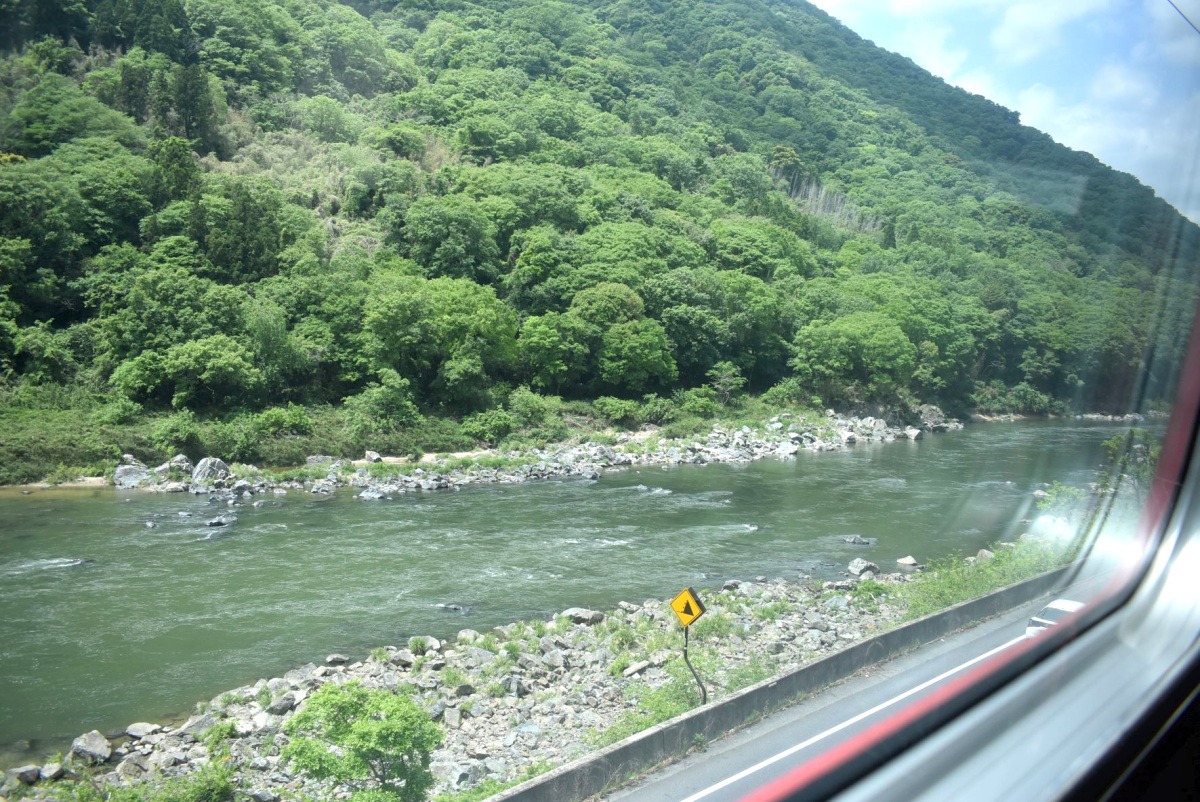 井原鉄道線が走る高梁川橋梁あたりから、一級河川・高梁川とともに岡山を駆け上ります!「豪渓」かあ。これから紅葉がキレイだろうな。と、ぼんやり景色を眺めていると、少しづつ揺れが感じられるように。どうどうと流れる川と、そびえ立つ山々。お構いなしに速度を上げて行くやくも。現役としてのプライドを感じる走りっぷりです。