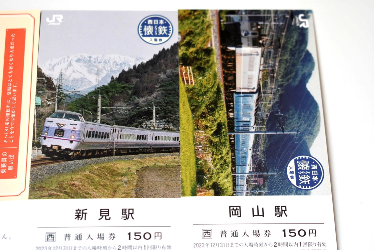 忘れてはいけません!懐かしの列車がデザインされた入場券「西日本懐鉄(ナツテツ)入場券」。鉄道開業150年記念で2023年末まで絶賛販売中です(県内では新見駅・津山駅・岡山駅の3か所のみ!)。そして今回特急券は、e5489ネット予約限定「トク得チケットレス」を利用しました。指定席で、チケットレスで、お得に!やくもに乗れておすすめですよ。