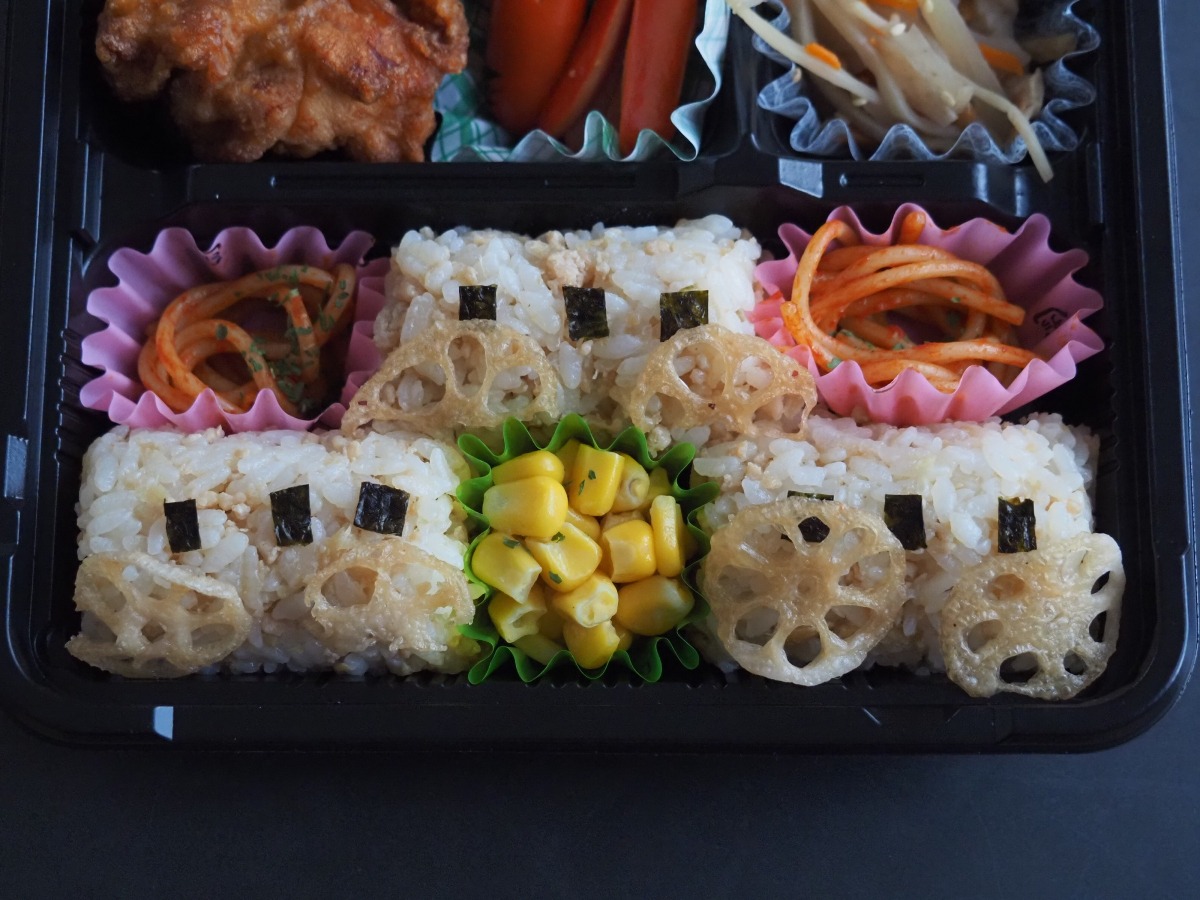 注目は、列車の形になったおにぎりでしょう。車輪にみたてたレンコンチップスが独創的! なんと、小学生が考案したのだそうです。