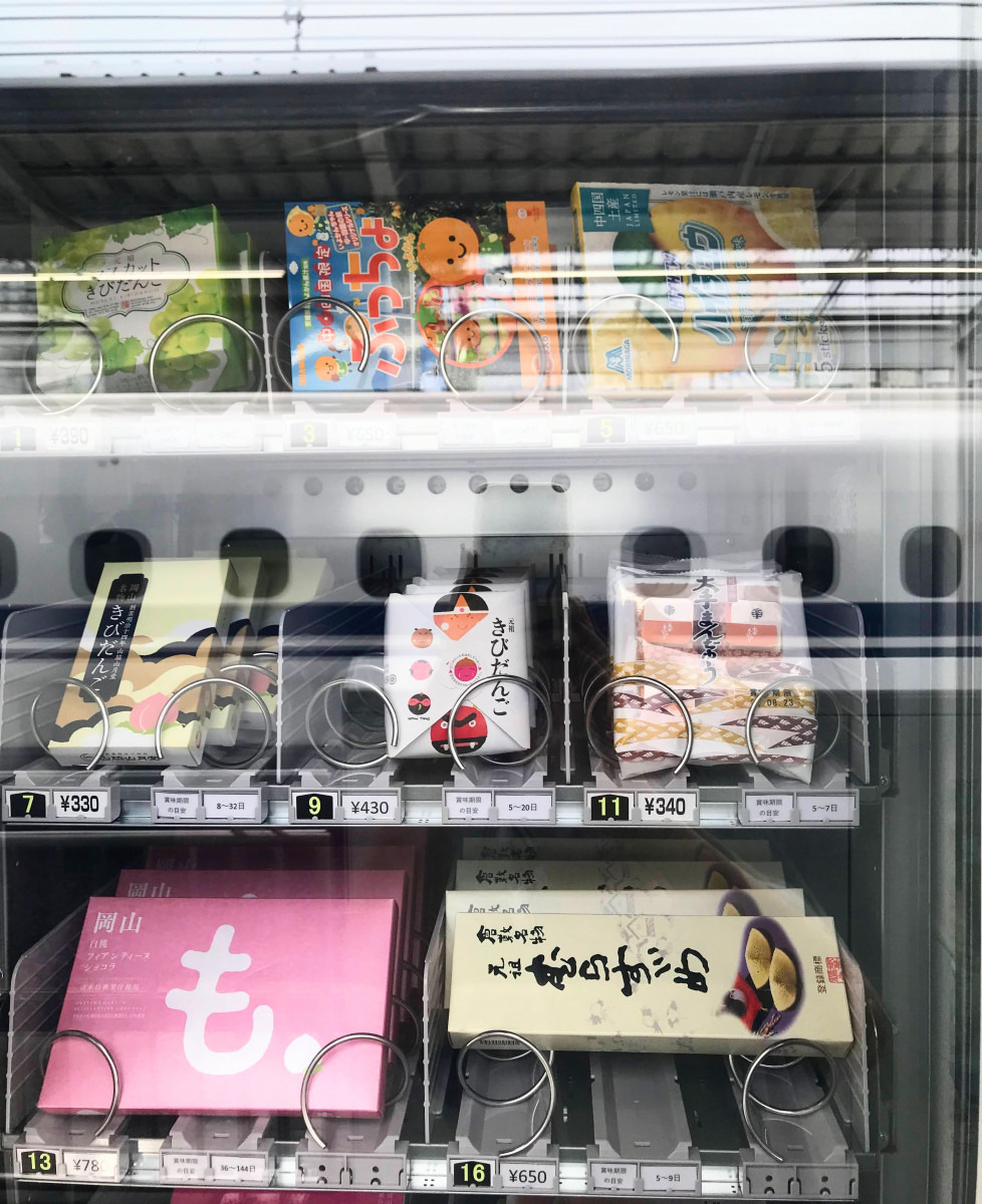 こちらは、岡山ならではのお菓子が並ぶお土産(箱菓子)の自販機。