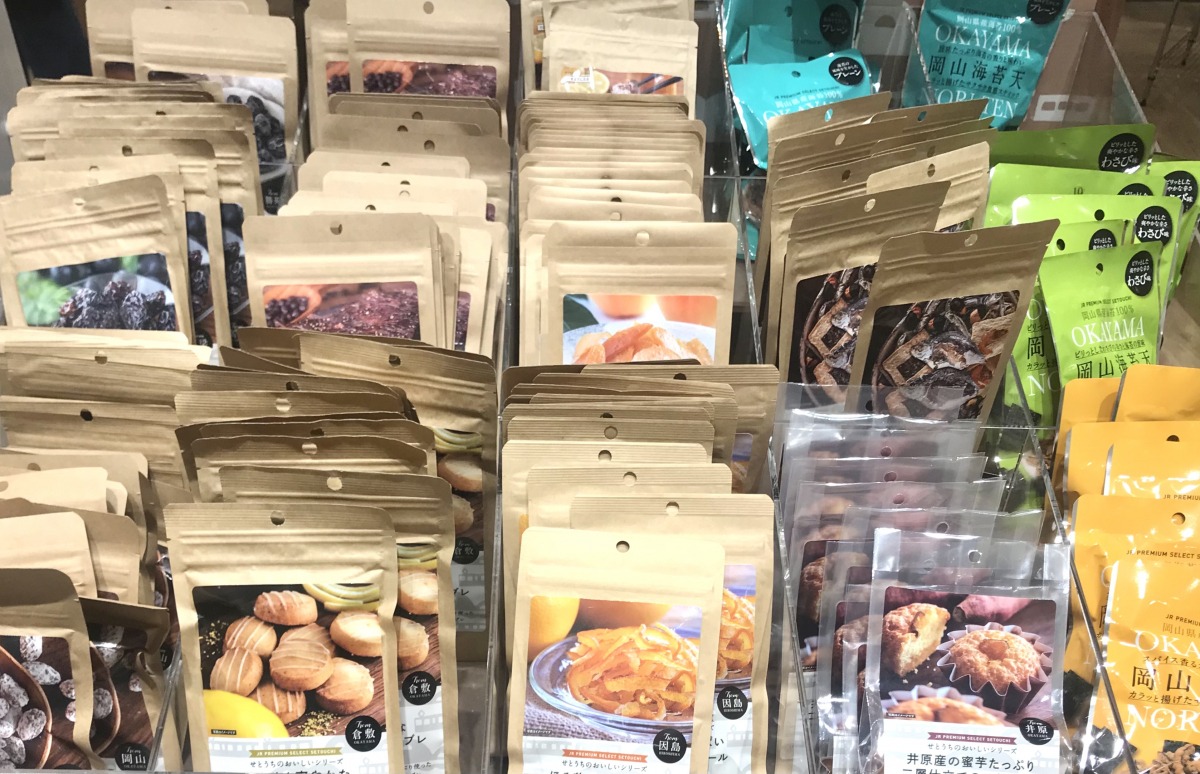 岡山といえば代表的なお菓子「きびだんご」「大手まんぢゅう」「むらすずめ」に、近年続々登場している新作のお菓子も並びます。お土産といえば箱入りのお菓子を選ぶという方も多いのではないでしょうか。でも新幹線で帰る頃にはお土産屋さんが閉まっている時間で買えない……そんな時にも便利です。