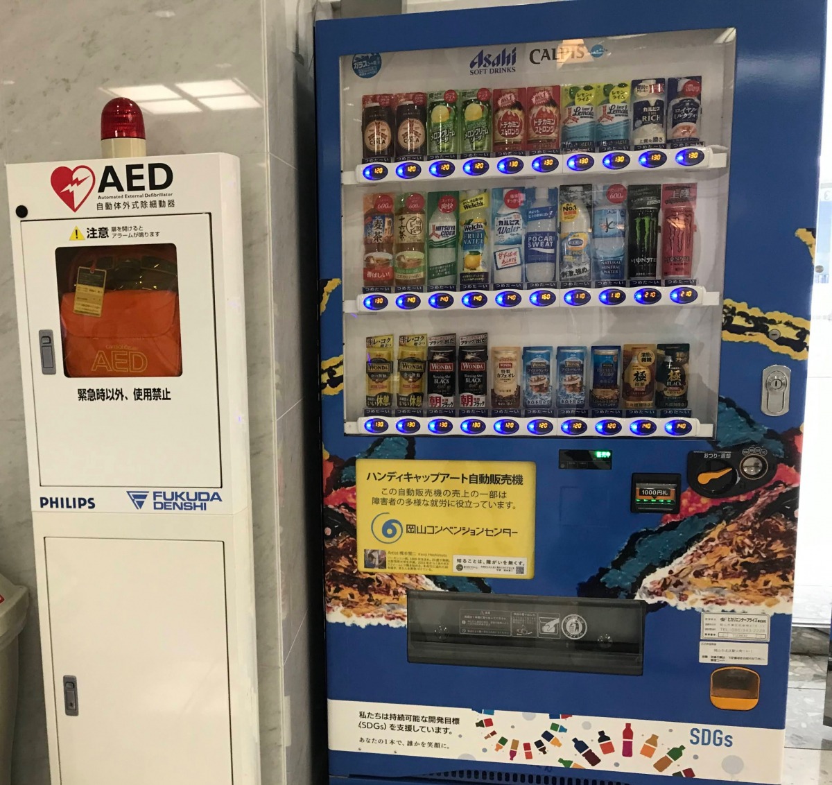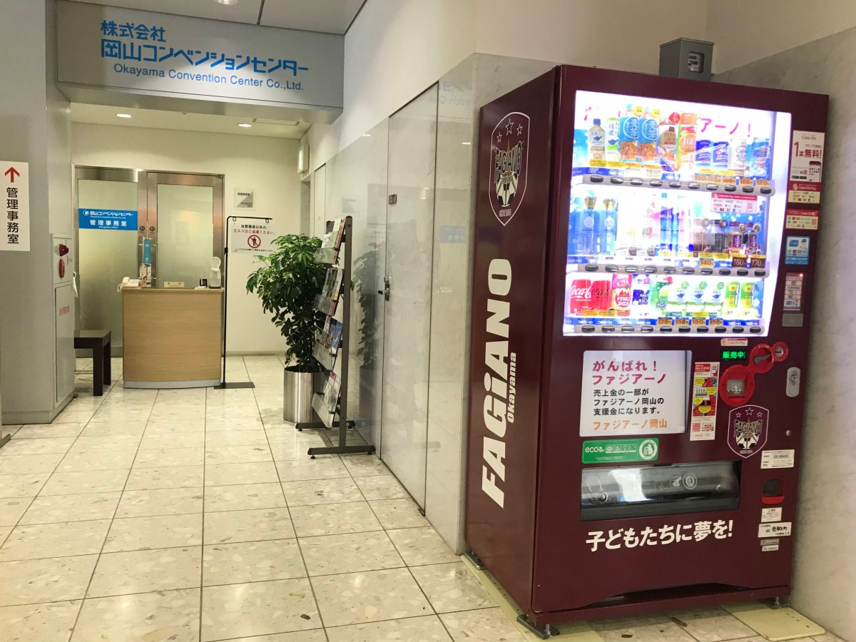 岡山市、倉敷市、津山市を中心とした岡山県全県をホームタウンとするサッカー Jリーグ「ファジアーノ岡山FC」を応援できる自販機が岡山駅近くにあります。