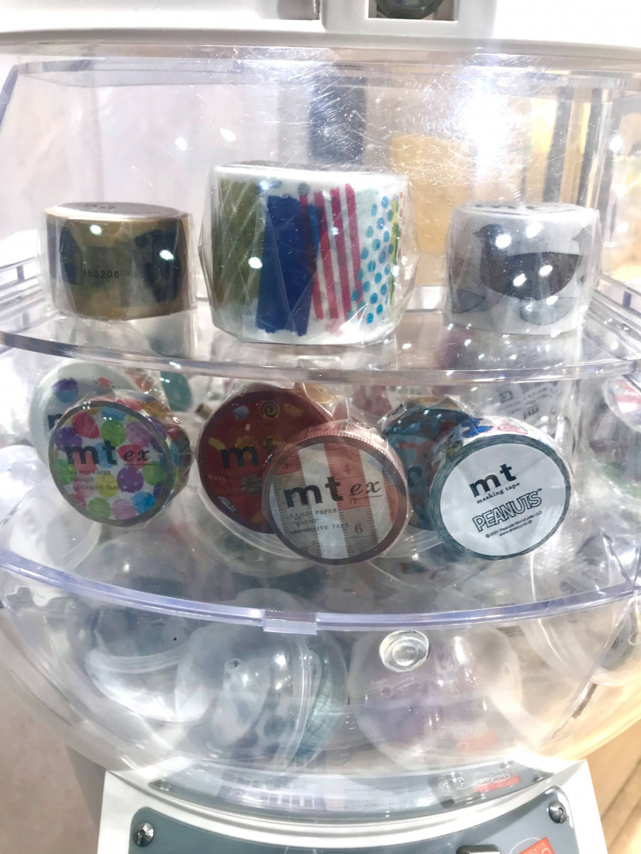 倉敷市発祥といわれる装飾マスキングテープで全国にファンの多いカモ井加工紙の「mt」(エムティー)が、ガチャでも楽しめます。標準サイズのmtは2本入り、幅広いタイプは1本入り。ガチャをのぞく度にラインナップが変わっていることもあり、mtコレクションをしている方に根強い人気です。