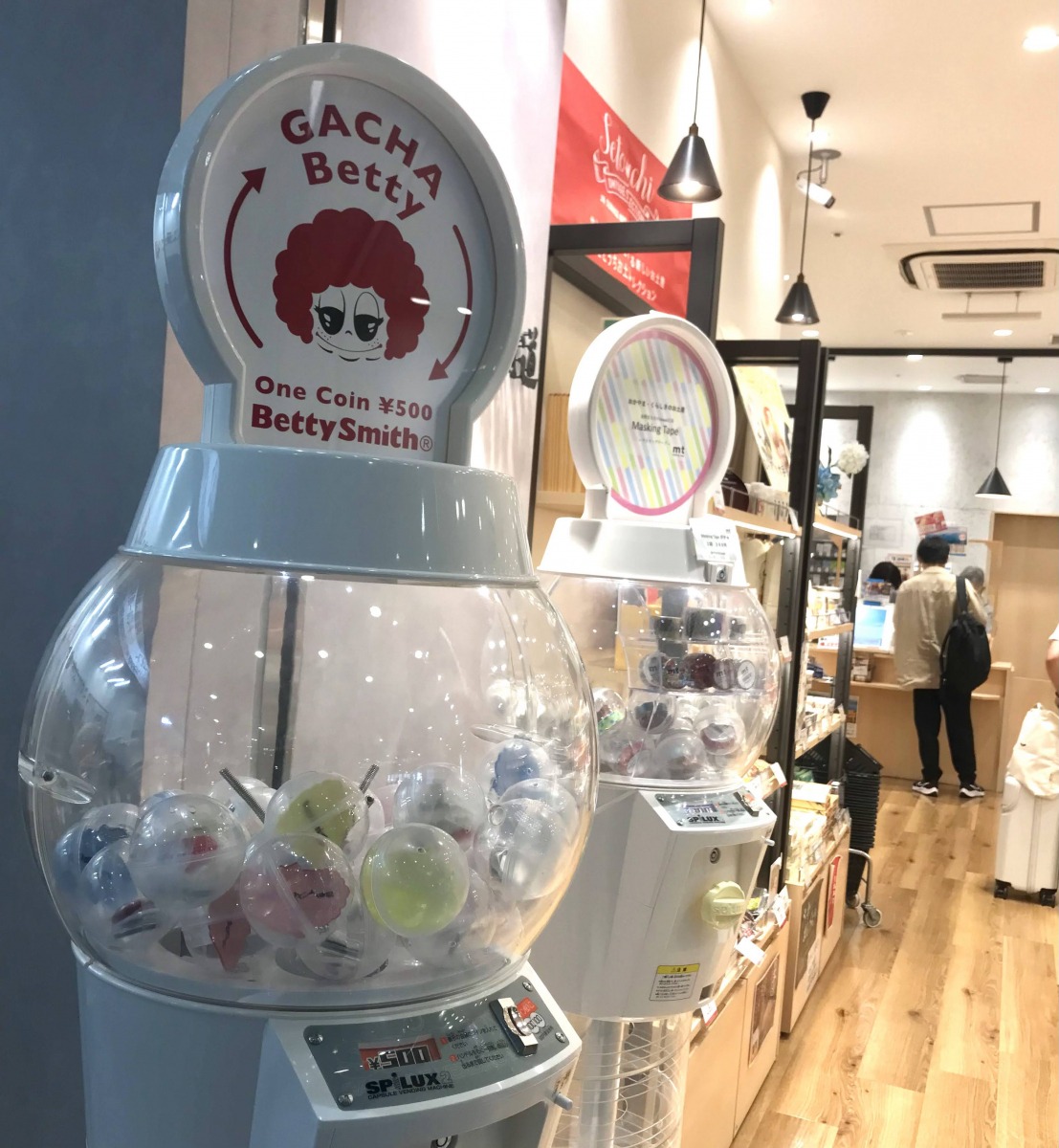 国産ジーンズ発祥の町、岡山県倉敷市児島(こじま)で初めての女性用ジーンズメーカーとして確固たる地位を築いたベティスミスのグッズが買えるガチャ「GATYABetty」(ガチャベティ)です。愛らしい「BettySmith®」のキャラクターのチェーンキーホルダーなど、長年のファンをはじめレトロ感もあって映えると若者にも親しまれています。