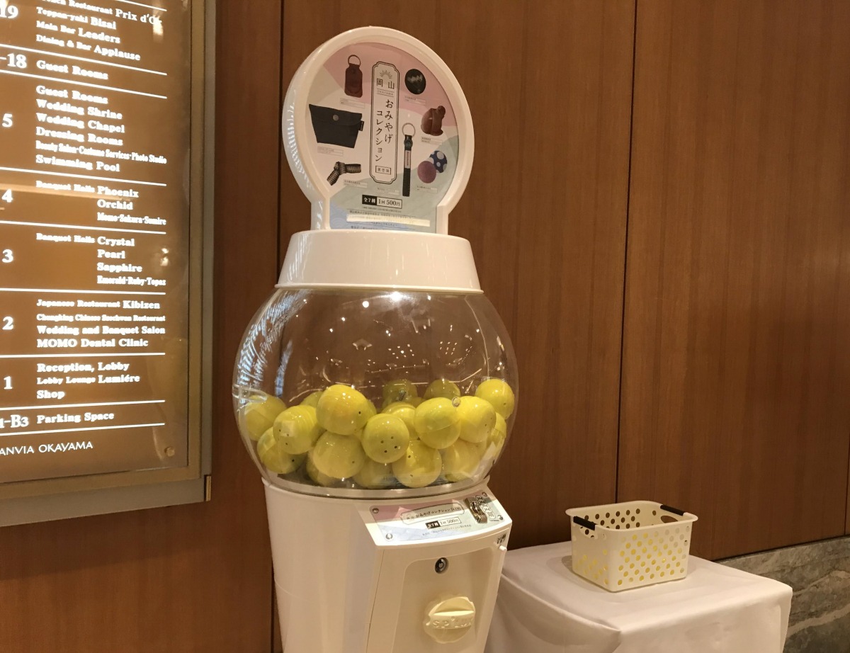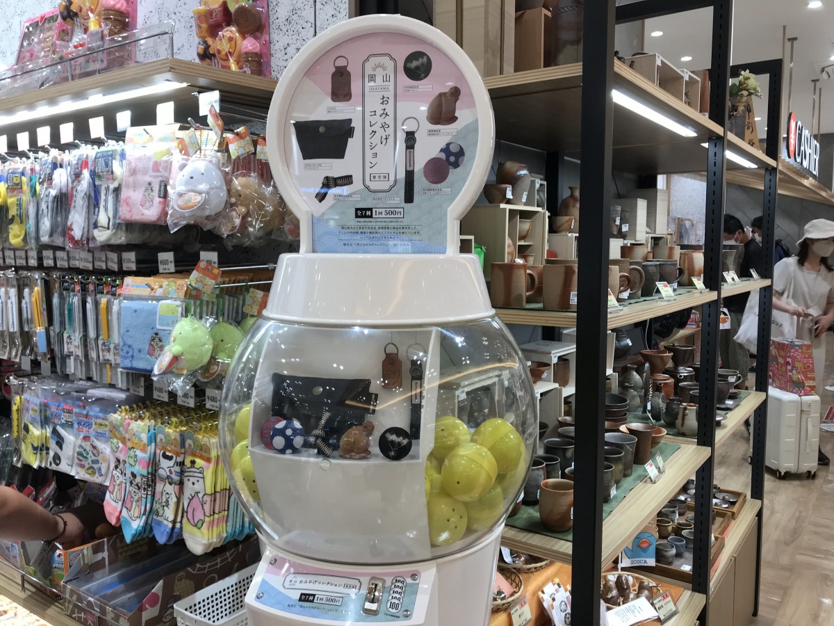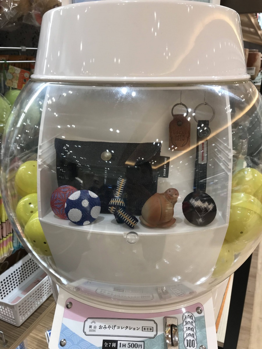 JR岡山駅のお土産店に地元 岡山県の企業の雑貨の「ご当地ガチャ」が設置されています。