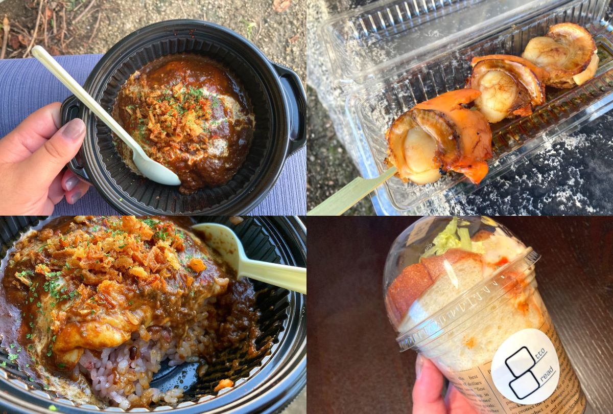 焼き鳥やホタテ串などのおつまみ系や、カレーやラーメンなどの主食系、サンドイッチなどのお手軽系など…。お腹いっぱいにならないサイズ感で、色々食べ歩きできるのが魅力的でした。