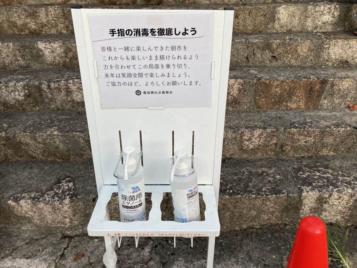 京橋朝市は、コロナ禍以前30年以上に渡り休むことなく開催されていましたが、感染症拡大の状況から中止になった時期もありました。現在は感染対策として色んな場所にアルコール消毒液が設置されています。他にも感染対策として決められた、マスクの着用・密を避けるなどのルールをしっかり守って楽しみましょう。