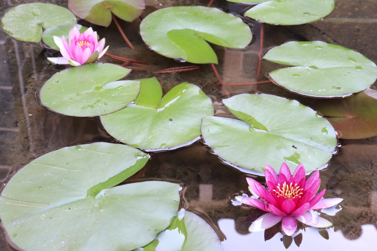 大原美術館の中庭には睡蓮がきれいに咲いていました。イエローやピンクの睡蓮が水面にうっすら映っていました。