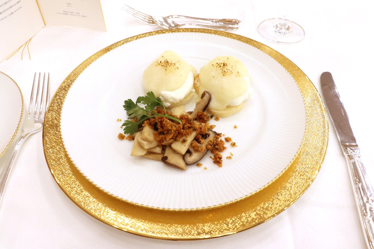 晴れの国の「お日たま(卵)」を使ったリヨン風ポーチドエッグとボルドー風茸のソテー