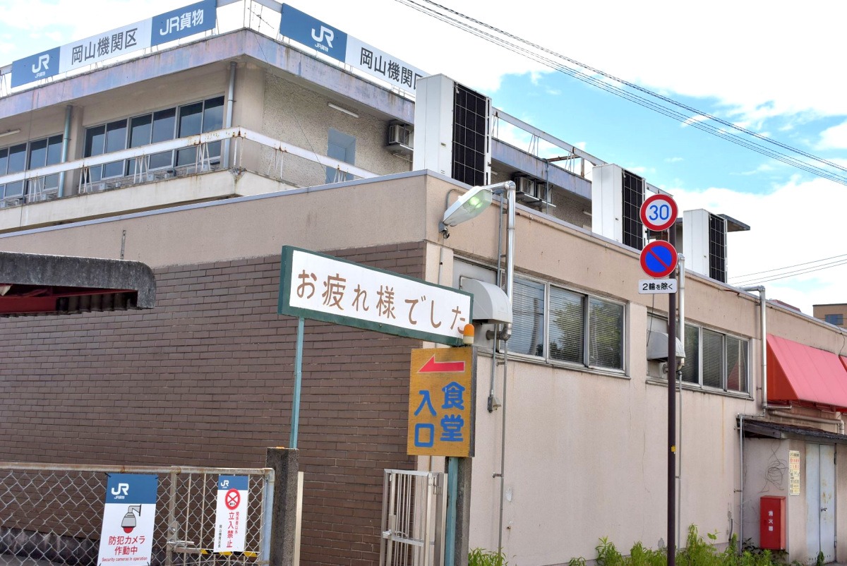 JR岡山駅東口から北長瀬駅方面へ進むと、「お疲れさまでした」という優しい看板とともに「食堂入り口」の文字が。JR貨物の社員食堂でありながらも、一般客の利用もOKという穴場スポットです!食堂の向かいの敷地にはDE10やEF64など、レトロな機関車の姿も。そしてなぜかニワトリの鳴き声も聞こえてきます。