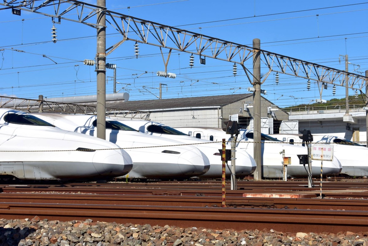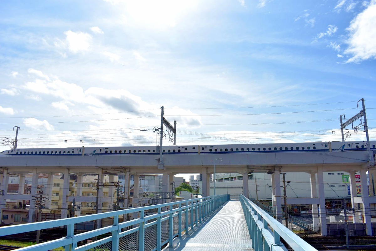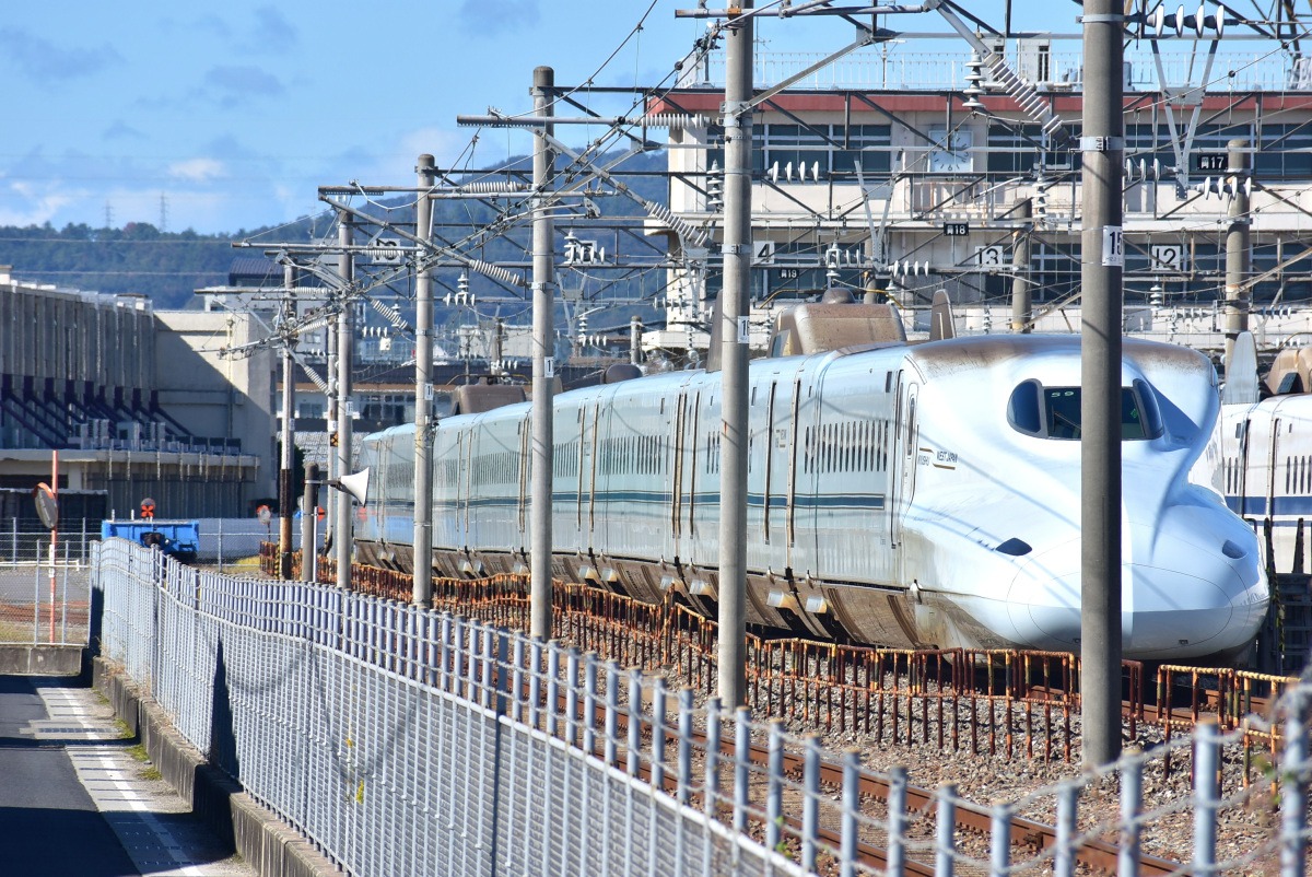 つづいてJR北長瀬駅から大安寺方面へ向かうと、現れました!新幹線の車両基地です。フェンス越しではありながらも、思わず「近っ!」と声が出るほどの至近距離。ちょうど緩やかな坂道になっているので、ちょっと下から新幹線を見上げられるというお宝スポット。曲線の美しさに見惚れてしまいますよ。