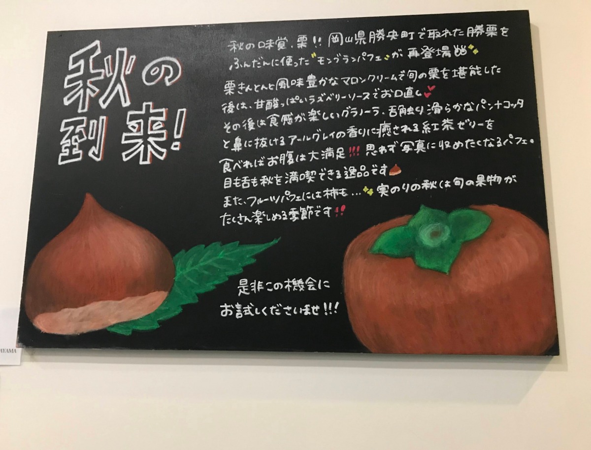 果物の絵がとても緻密で美しく、どなたが描いていらっしゃるのか気になってお尋ねすると、スタッフの方がすべて制作され「一気に描き上げる時は2時間ほどで仕上げています」とのこと。