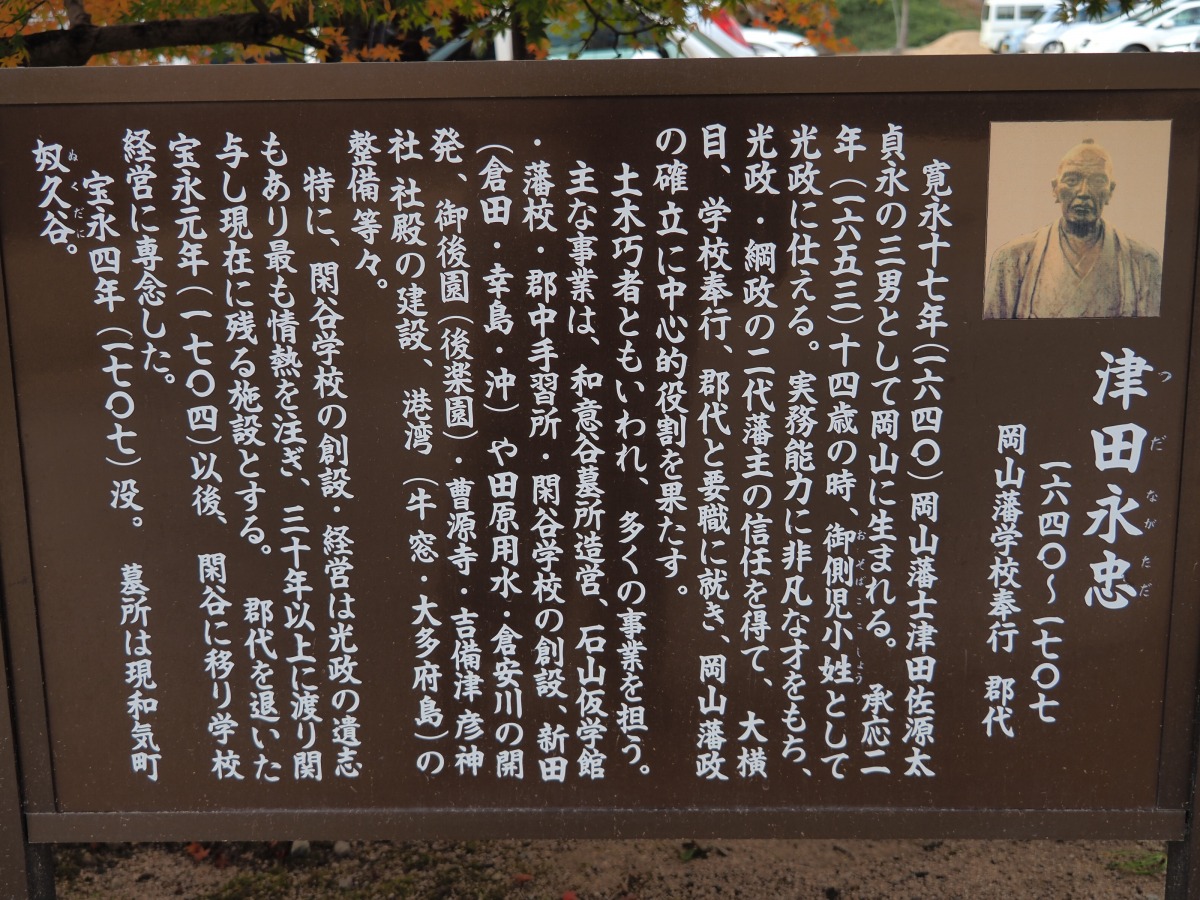 津田永忠は閑谷学校の建設のほかにも、後楽園の造営、百間川の開削や沖新田の開発などを手掛けた人です。