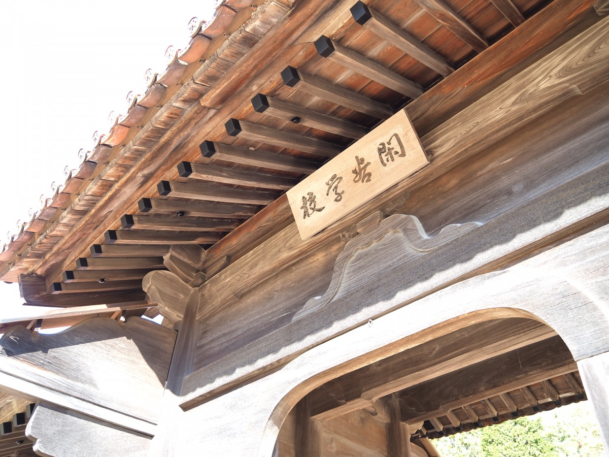 校門は「鶴鳴門(かくめいもん)」ともよばれ、正門です。屋根は備前焼の本瓦葺きで、しゃちほこが佇んでいます。