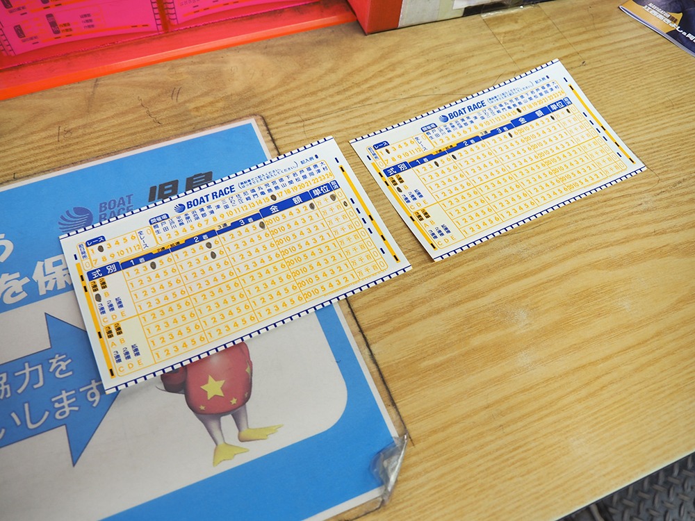 施設内にはたくさんの「投票所」があり、その付近のテーブルに記入用の「マークカード」が置いてあります。該当する場名・式別・レース・1着~3着・金額に印をつけていきます。