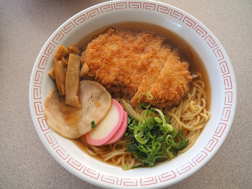 勝利を予感させる「すずらんのカツ三兄弟」は、「カツカレー」・「カツラーメン」・「カツカレーラーメン」。こちらは「カツラーメン」です。さくさくのカツがラーメンの上にドーン!