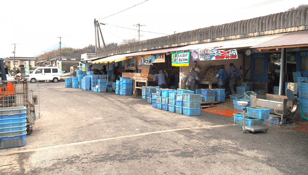 寄島町漁協付近には、各生産者の加工所と直売所が一緒になった建物がずらりと並ぶエリアがあり、昼頃までに行くと、あちこちで牡蠣を選別している様子を見ることができます。