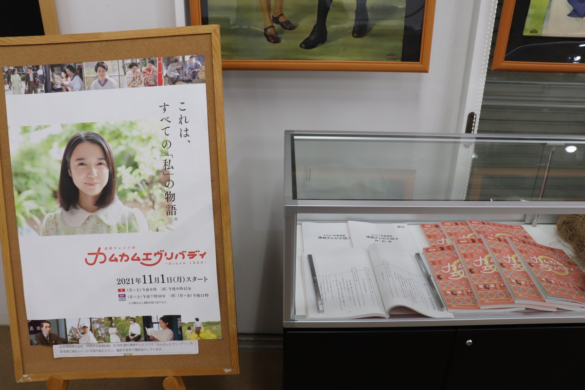 資料のコーナーに 、NHK 朝の連ドラ「カムカムエブリバディ」のコーナーがあります。上白石萌音さん演じる主人公「安子」のポスターと台本が展示されていました。主題歌の「アルデバラン」が頭の中を流れました。台本の隣には、ドラマの中で使われた、児島の繊維文化の原点ともいえる足袋も展示されています。