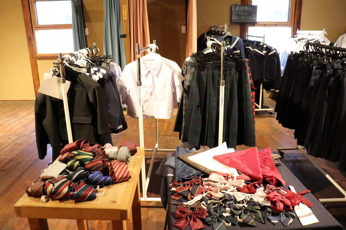 展示会場の2階は、制服体験コーナーです。セーラー服、ブレザー、学ランなどたくさんの種類の制服がありました。