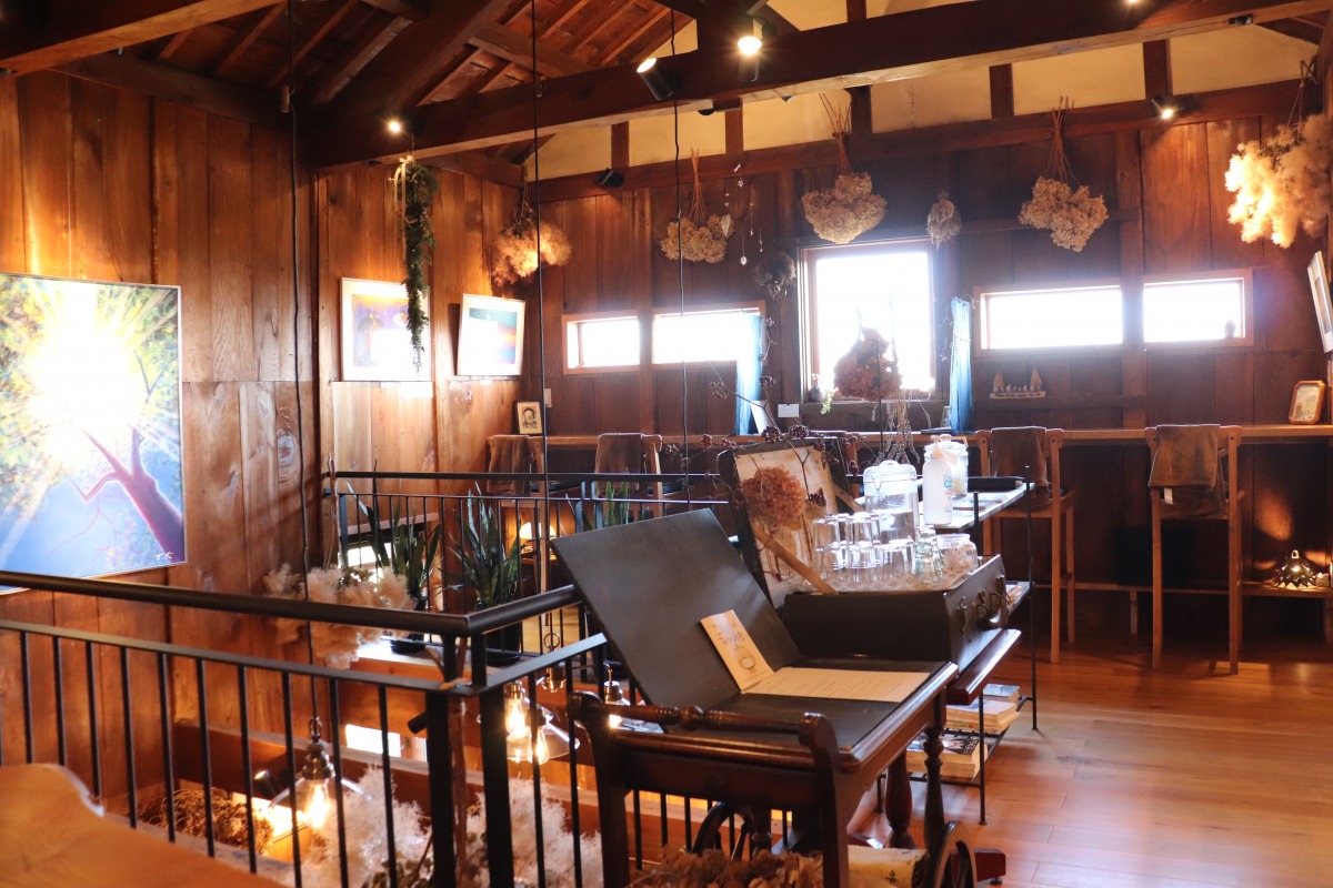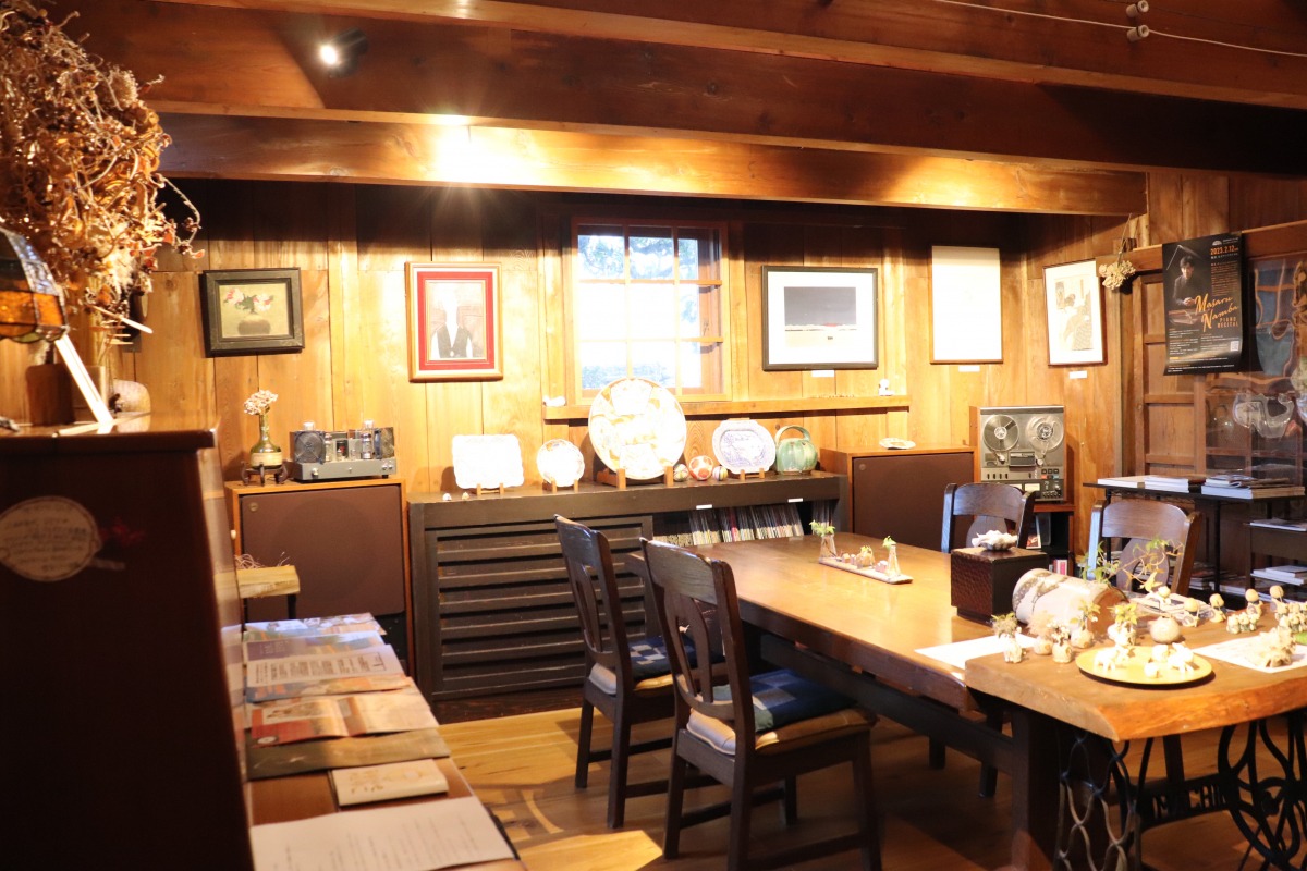 蔵カフェの玄関を開けると、靴を脱いで、蔵の入り口があります。なまこ壁がそのまま見える玄関スペースは、江戸時代に建てられた蔵の歴史を感じます。1階には、オーナーさんの思い入れのあるアンティークなものが並んでいて、店内に流れるクラシック音楽は真空管アンプ、そして1970年代のスピーカーを通して流れています。とても落ち着く空間です。