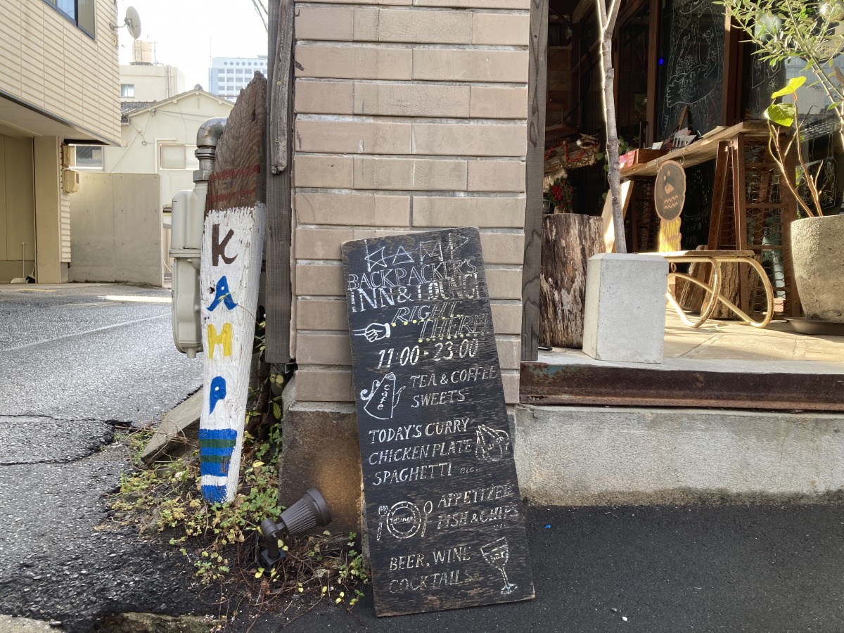 「KAMP BACKPACKERS INN & LOUNGE」と書かれた味のある立て看板!