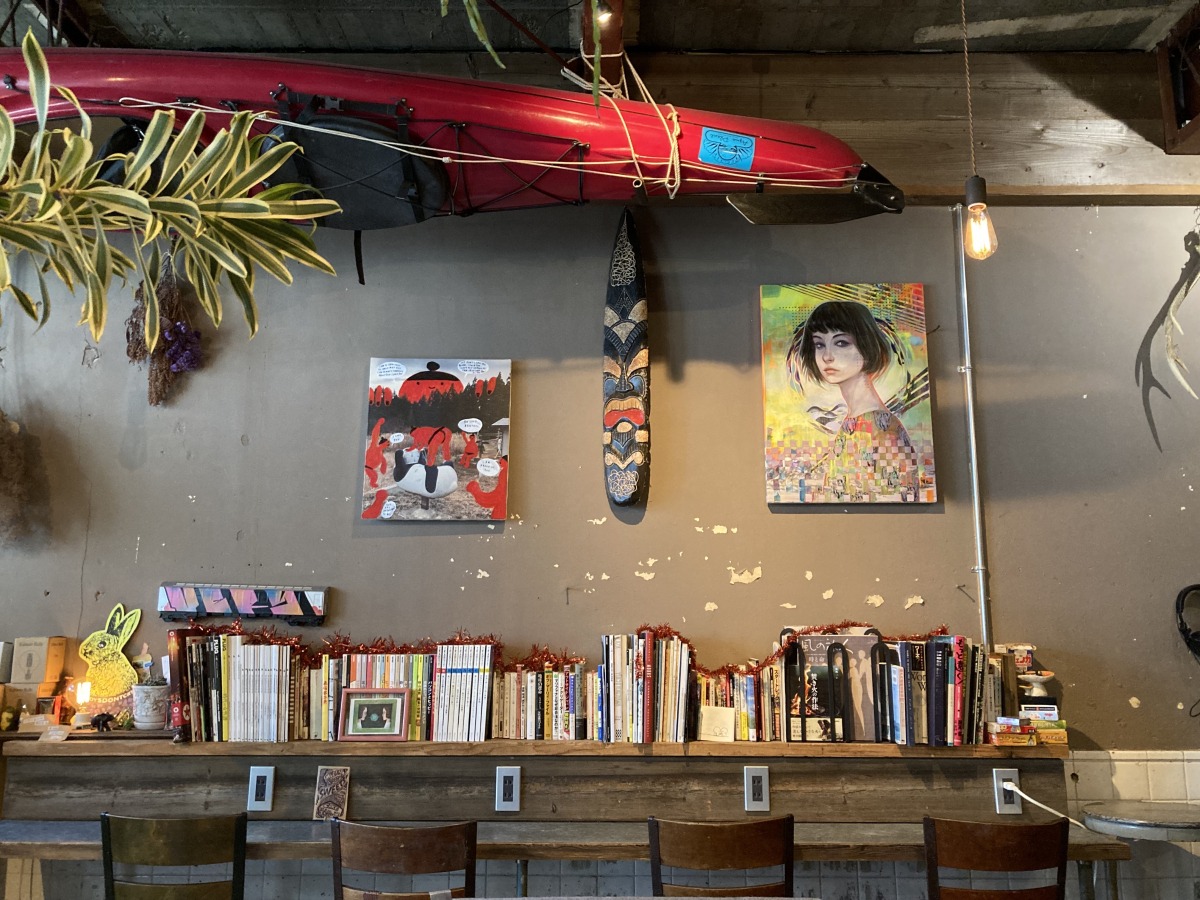 壁に並べられたカルチャー雑誌、飾られているアーティストの絵。
