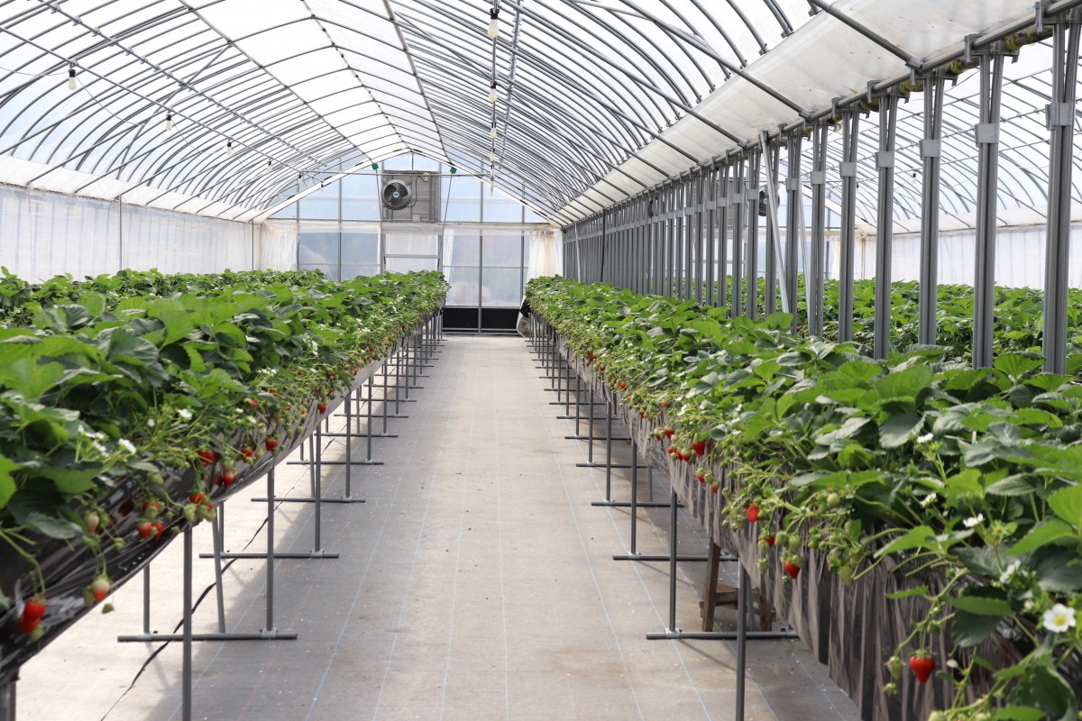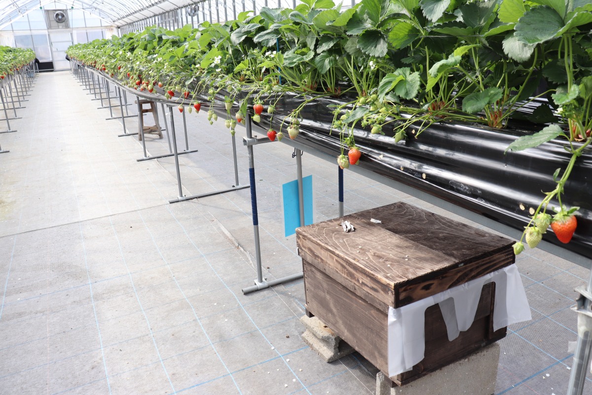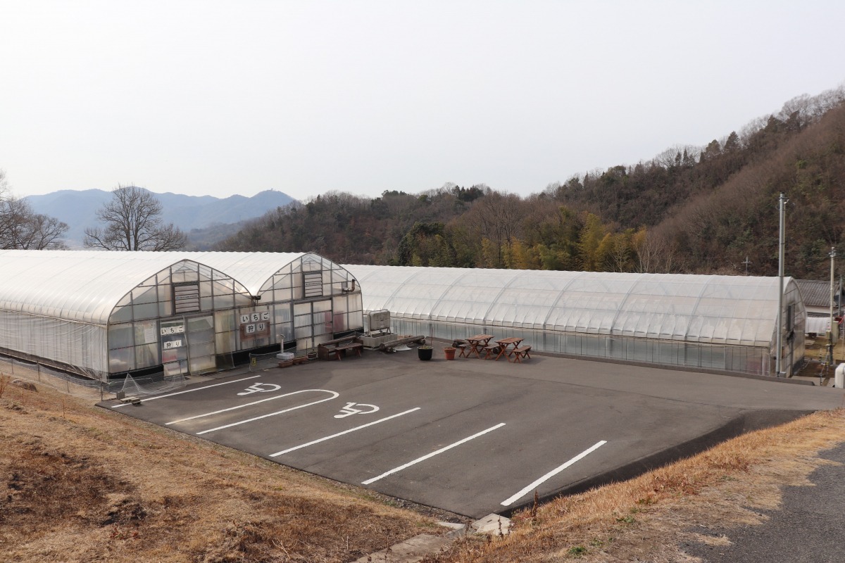 いちご狩り体験のハウスは、建物の裏にあり、歩いてすぐのところにあります。水耕栽培の「さがほのか」、地植え栽培の「よつぼし」のハウスがあり、いちご狩り体験は、水耕栽培の「さがほのか」でします。