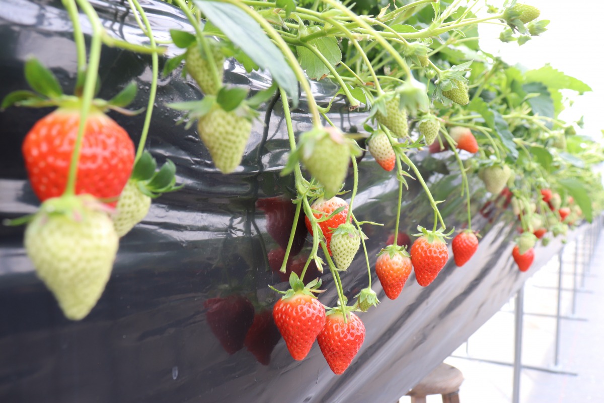 寒い外から、いちごの水耕栽培ハウスに入ると、一眼レフのレンズが曇り、曇りが取れるまで撮影停止に・・・。それぐらい湿度が高くて温かいハウスでした。コートを着ていると汗が出るくらいです。真っ赤に色づき、高い位置からぶら下がったいちごの甘い香りで、いちごを食べたい気持ちがこみ上げてきました。