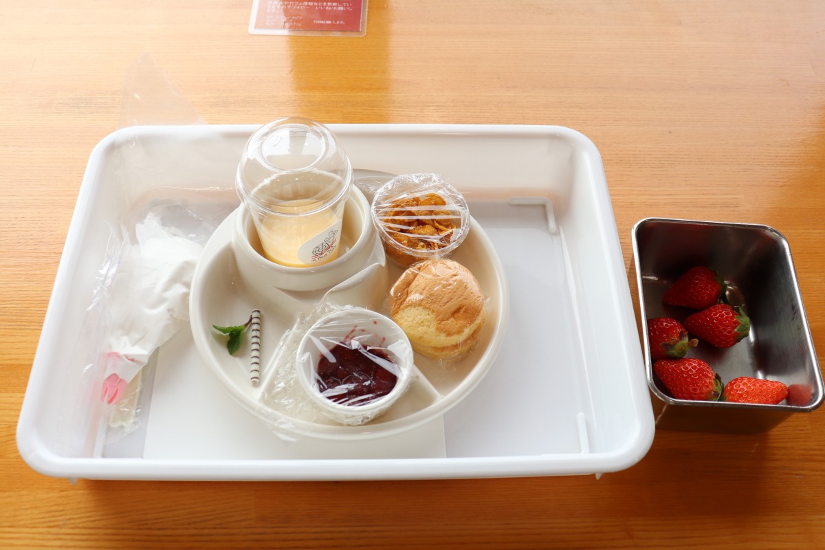 運ばれてきた材料を見て、どんなパフェを作るかイメージしました。カップの底には手作りのプリンが入っています。スポンジもイチゴジャムも自家製だそうです。飾りのチョコ棒とミントもついています。使ういちごは小さめを5個。どんな風にデコレーションするか考えるのも楽しいですよ。スタッフさんに説明してもらいながら作るので安心です。