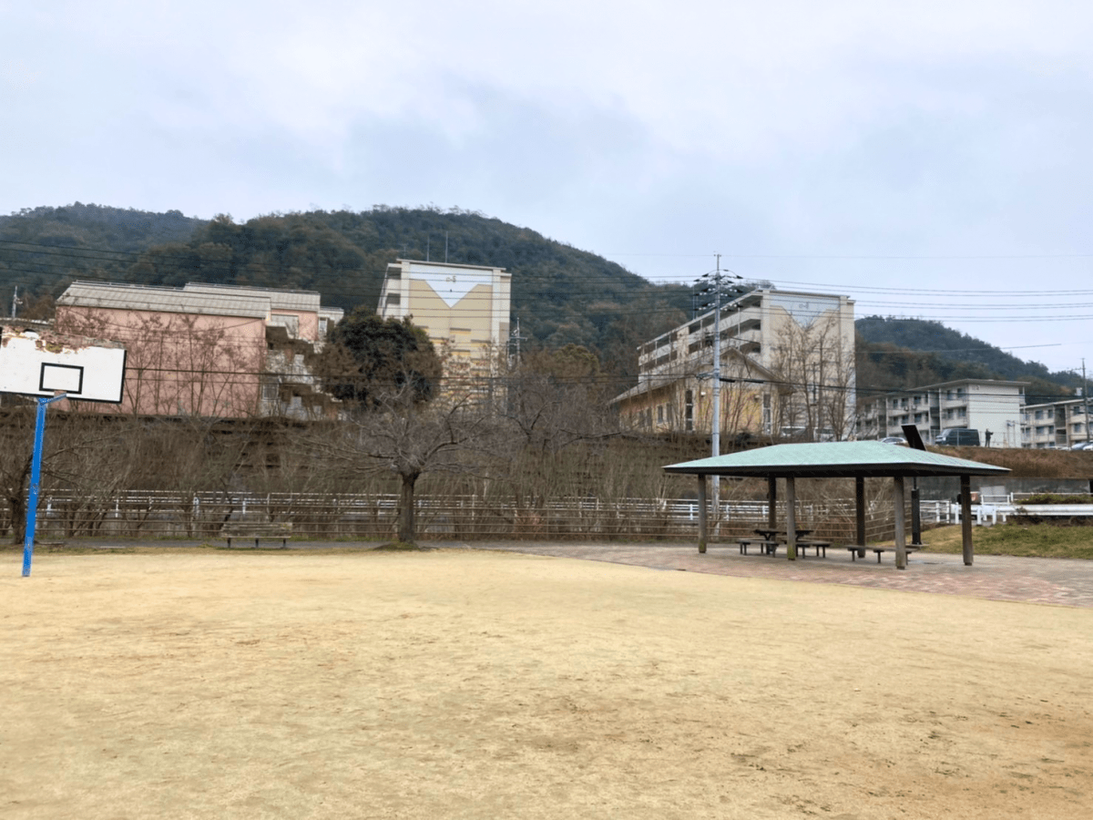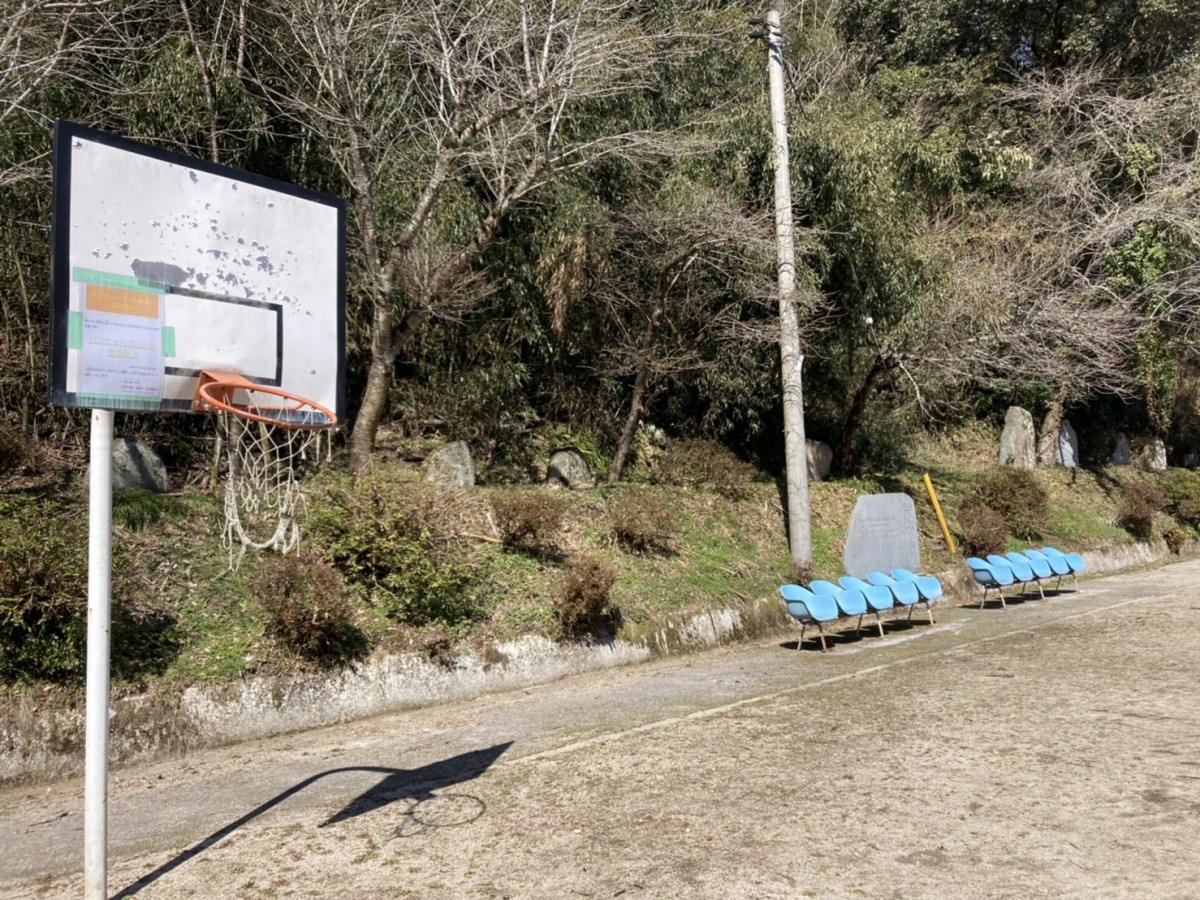 玉野市にある「玉野親水公園」は、志池のほとりに伸びた公園。遊具のある広場とは別の場所、多目的グラウンドにバスケットゴールが2基立っています。