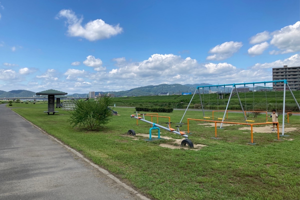 百間川緑地公園は横に広く伸びており、スポーツを楽しめる施設から少し離れると遊具のある公園もあります。お散歩スポットとしても多くの人で賑わっています。