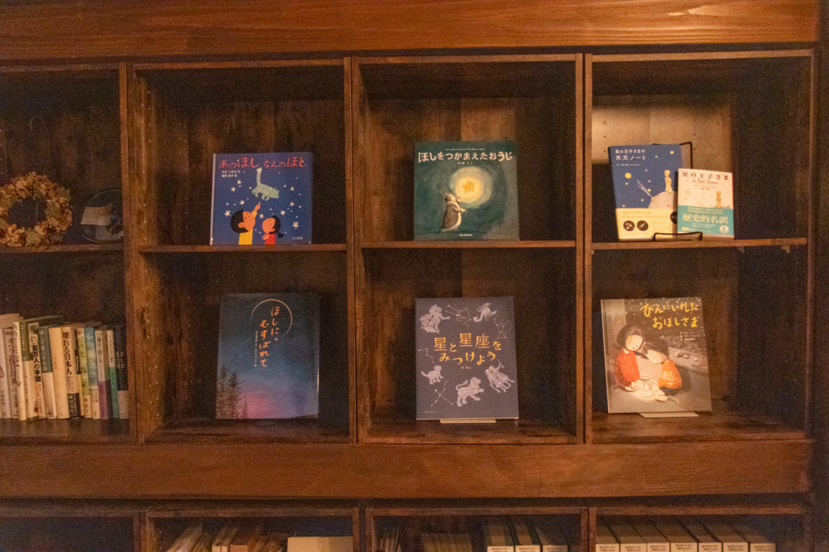 本田氏の自宅であった建物を改装した店内は落ち着いた雰囲気のブックカフェとなっていて、星空に関する本などが多数並べられています。