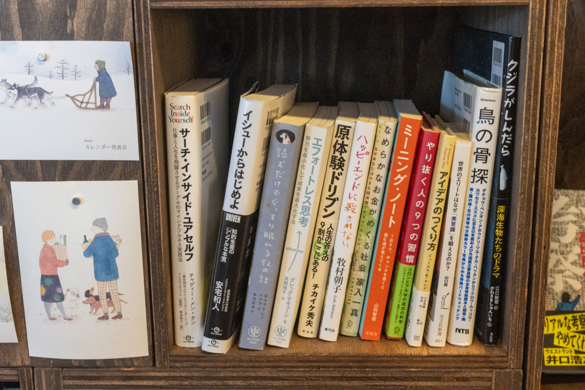 実際に近隣の店舗や個人のかたが本棚オーナーとなっていて、個性が光る選書が並んでいます。それぞれの本棚はお客さんとオーナーをつなぐ間接的なコミュニティとしての機能も持っていて、本を読んだ感想をカードに書いてオーナーに送ることもできます。