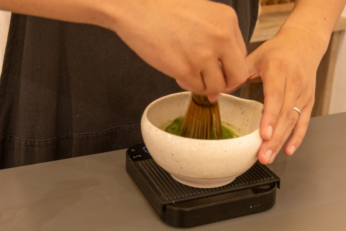 抹茶に親しんでもらうために、こちらでは「お茶点て体験」ができ、自分で点てたお茶を使って看板商品の抹茶ラテなど、希望のドリンクに仕立ててくれます。