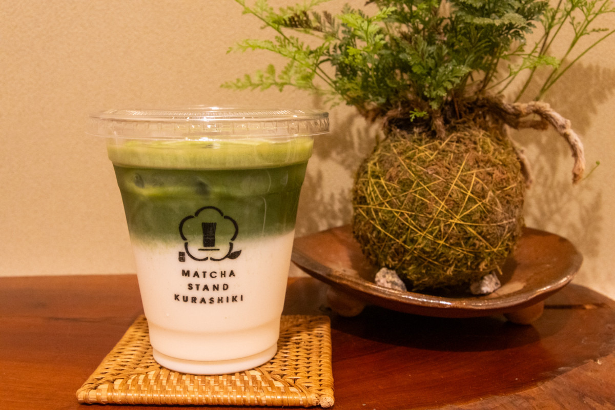 京都産の抹茶と岡山県産牛乳で作られる抹茶ラテ、甘さも普通・控えめ・無糖から選ぶことができます。また、カウンター横には倉敷グリーンファームの苔玉とともにできあがった商品を撮影できるスポットも用意されているので、飲む前に記念撮影もおすすめ。