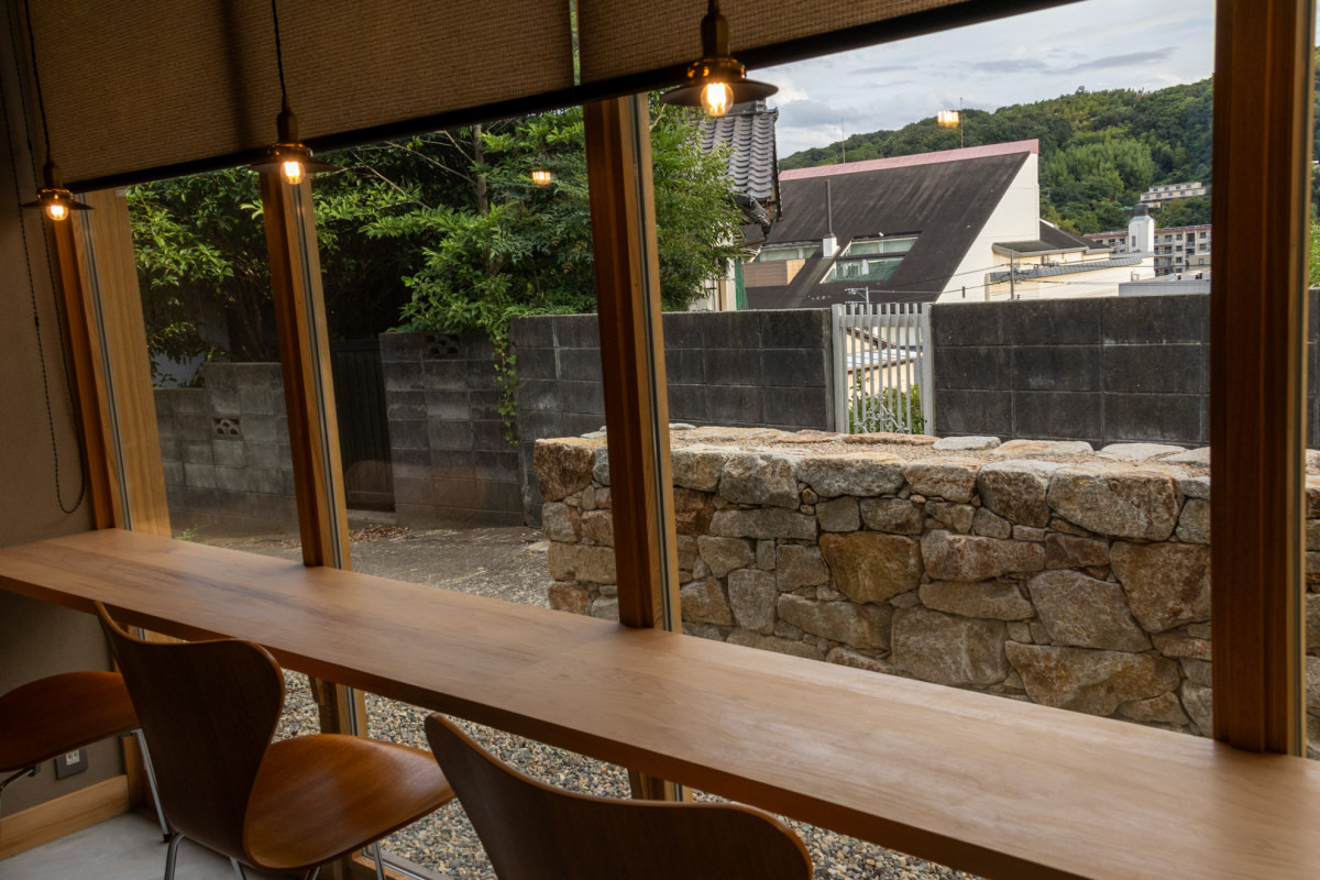 コンクリート打ちっぱなしの店内は、南向きの大きな窓辺にカウンター席、左手にテーブル席があり、観光客でにぎわう本町通りの喧騒を忘れさせてくれる隠れ家です。