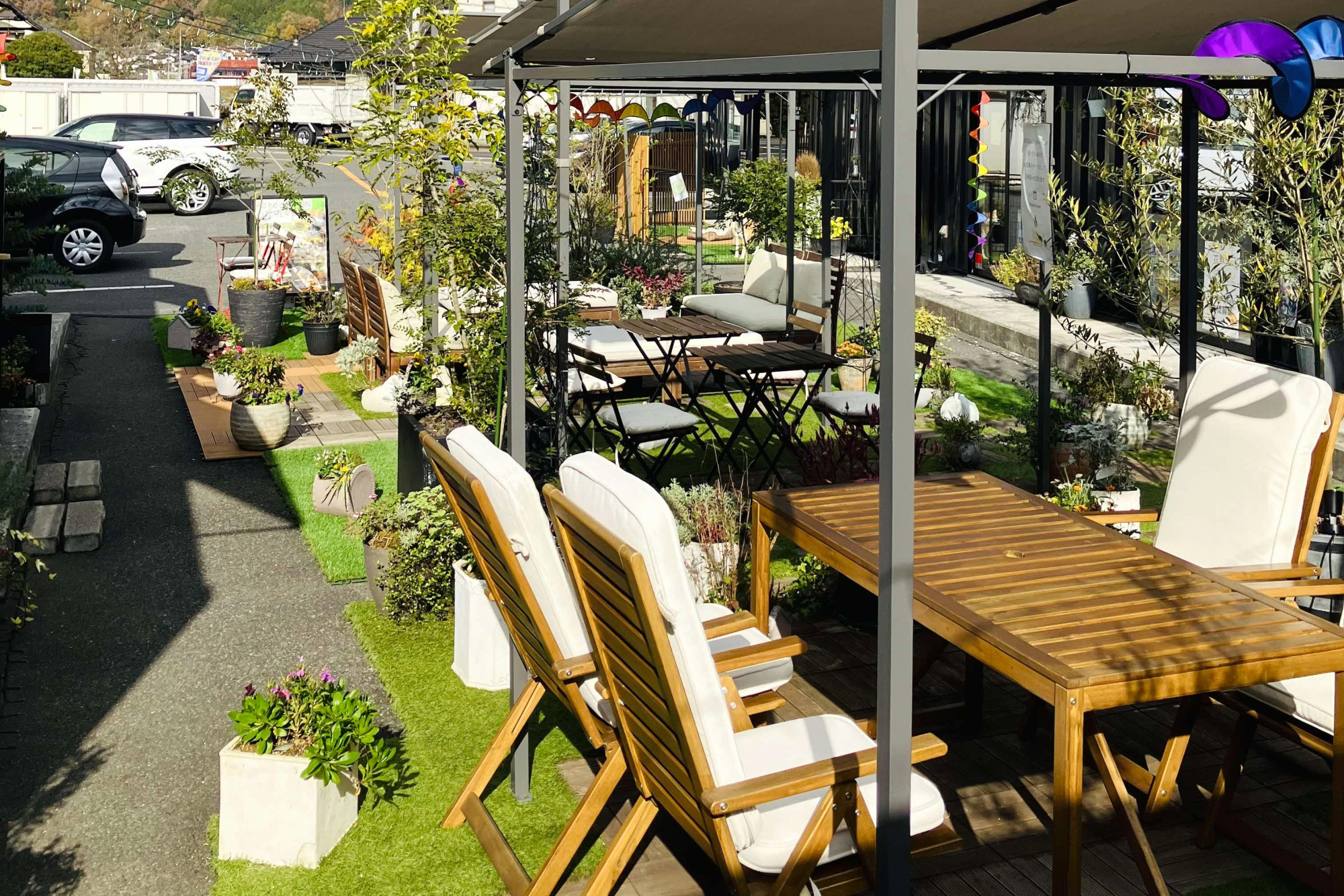 国道沿いのガソリンスタンドに隣接した、お洒落なコンテナカフェ。看板犬は柴犬のポポちゃん。パラソルやタープの下で食事が楽しめるガーデン席はペット同伴もOKです。