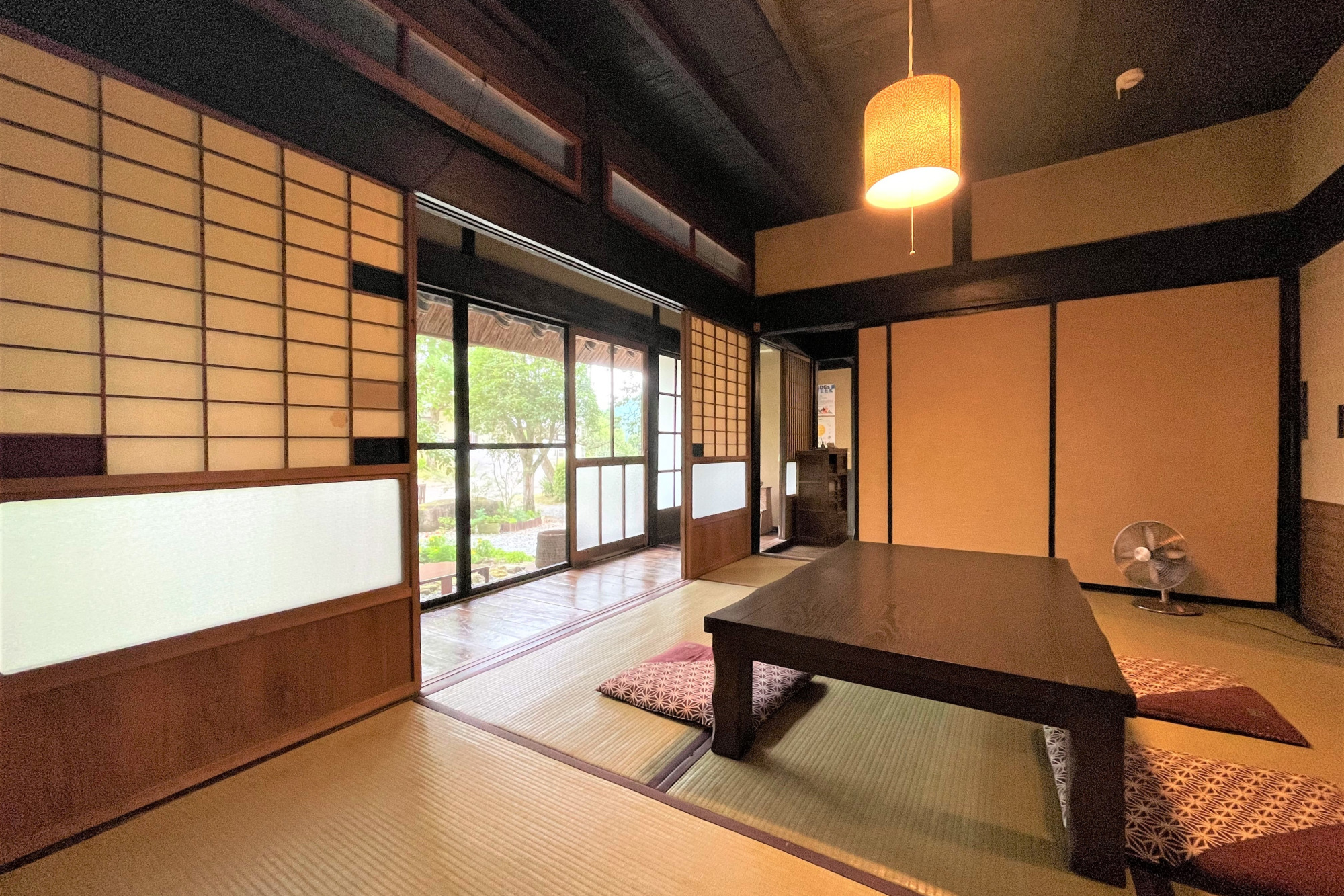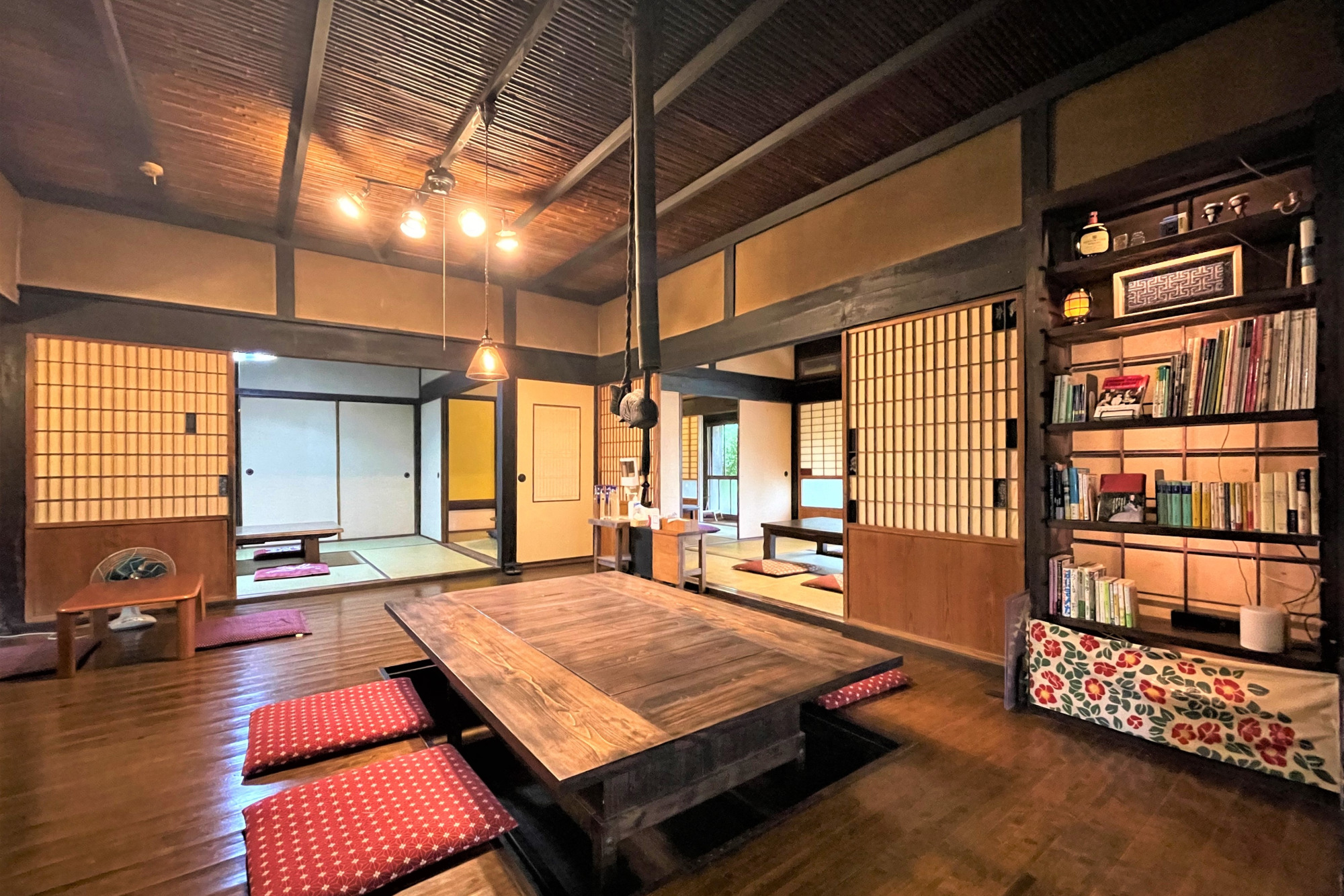 縁側に面した座敷に、田の字型に配された板の間と畳の間など、落ち着いた雰囲気が漂う空間。板の間には掘りごたつ式の大きな囲炉裏もあって、天井から吊るされた自在鉤も古民家ならでは。民宿としても営業しており、カフェが終わった後、各部屋は客室やリビングに変身します。