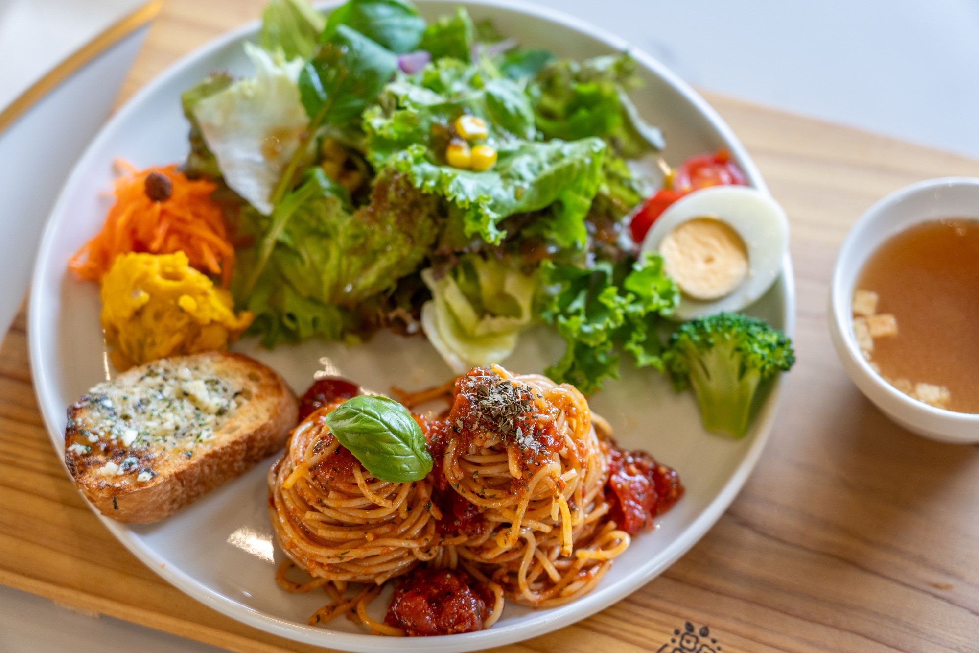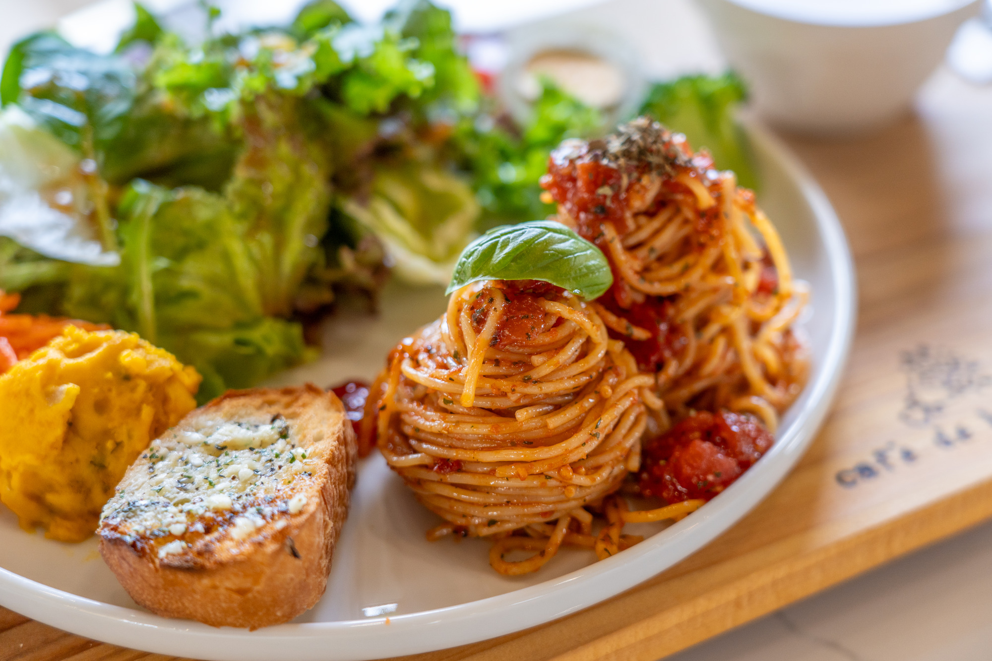 2024年オープンの「café de bouquet」は、オーナーの“楽しみたい!”という想いを形にした場所。自家栽培や地元産の野菜がたっぷり添えられたランチは日替わりで、パンバーグやからあげ、チキンソテー、ミックスフライ、タコライスなどから1~3種類が登場します。ソースやドレッシングも自家製で、メニューにあわせてアレンジを加えているので、訪れる度に新たな美味しさとの出会いがあるのも楽しみ。この日のメインは「バジル香るトマトパスタ」(1,280円)。ランチにはプラス300円でコーヒーか紅茶が付けられます。