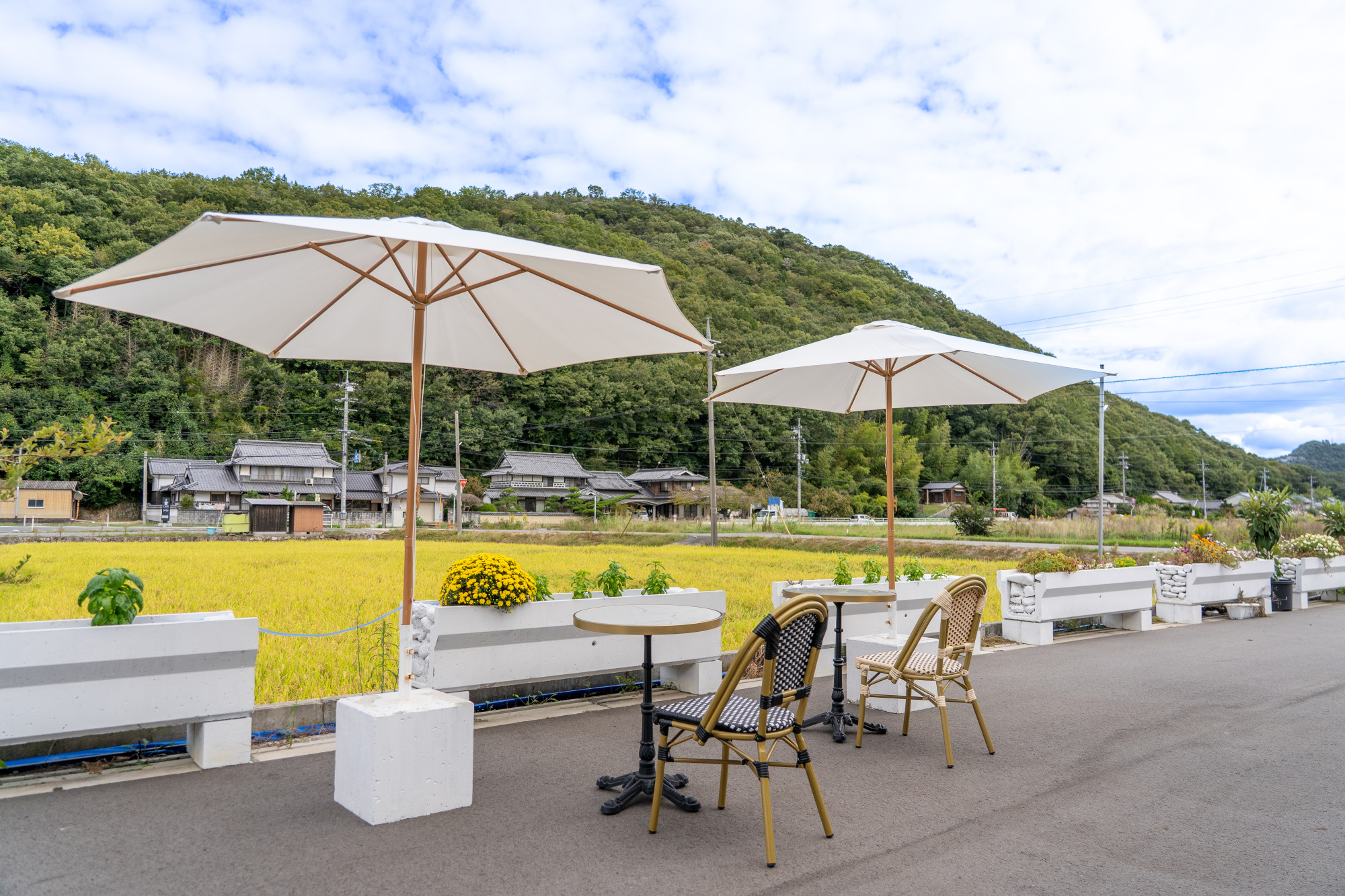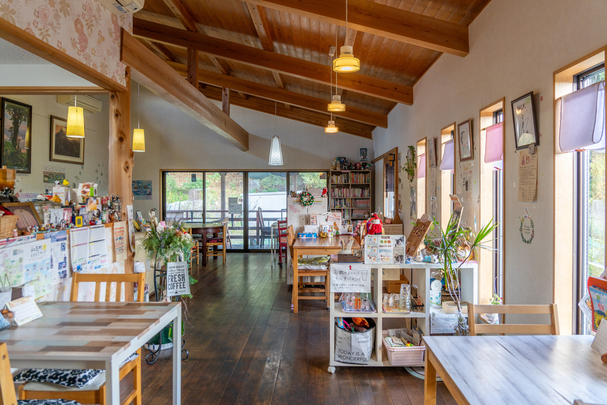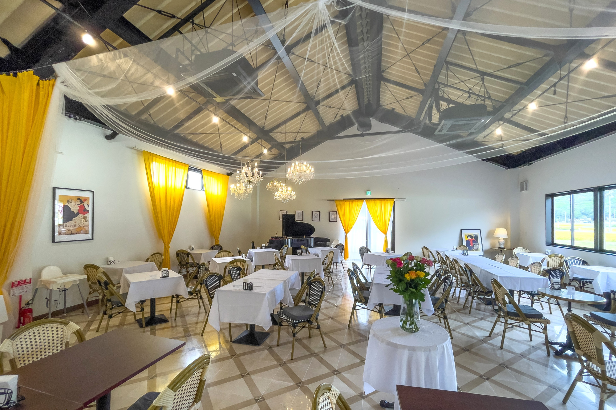 店内は想像以上に広々としています。倉庫を思わせるインダストリアルな雰囲気に、フランスのカフェのようなテーブルや椅子が配置された100名以上が入れる空間では、ライブや演奏会などのイベントも開催。今後はカフェウエディングも計画中とか。また、屋外のテラス席はペット同伴で利用でき、将来的にはドッグランもオープン予定です。