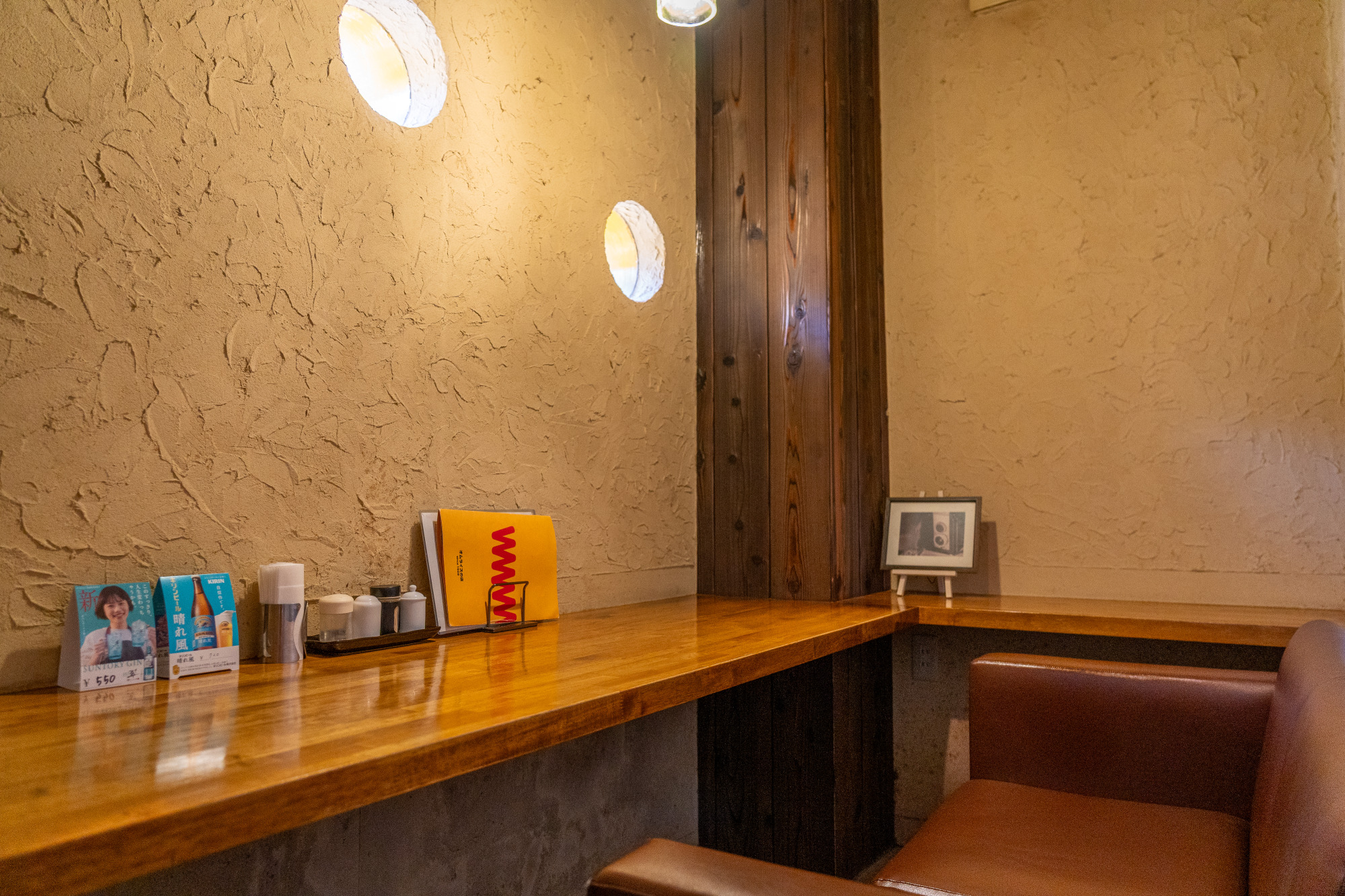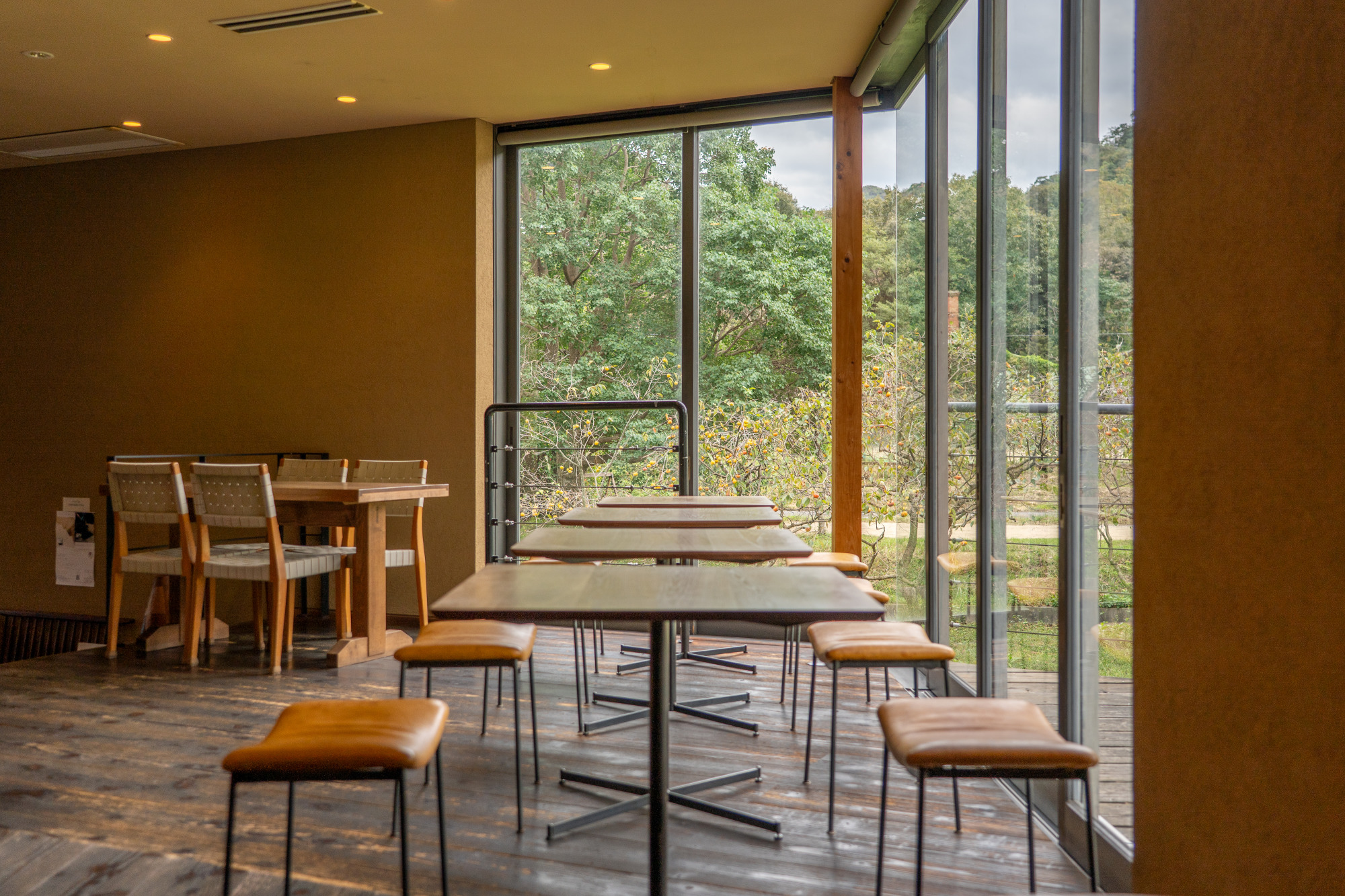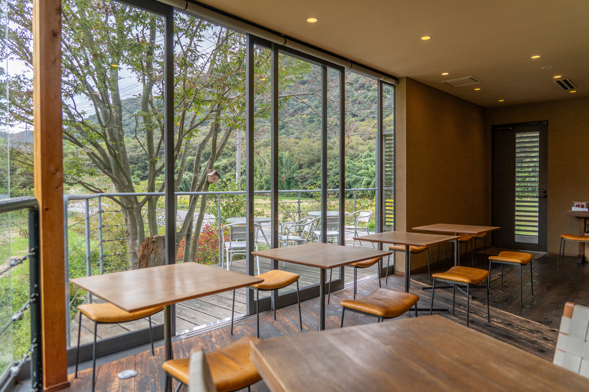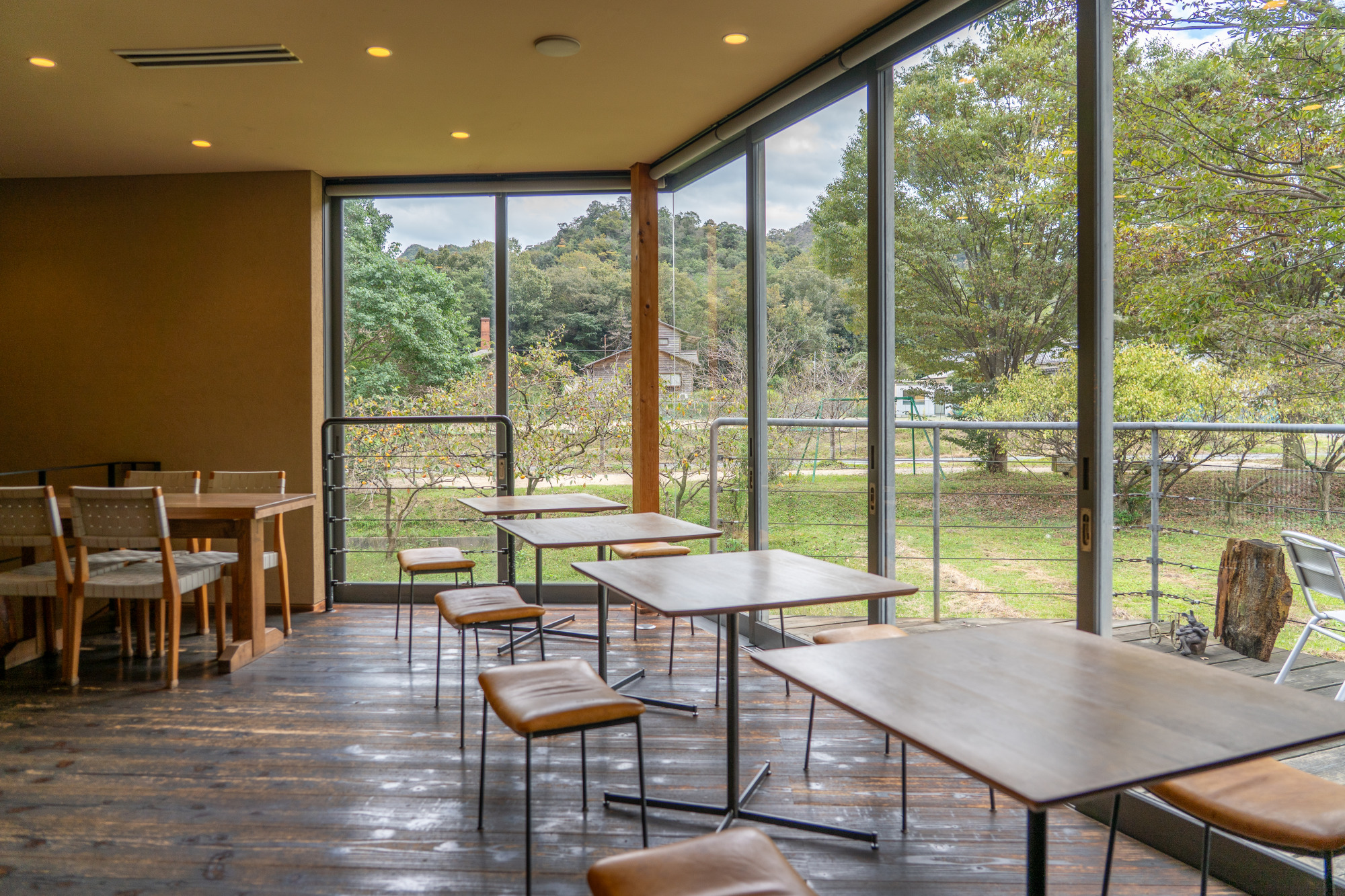 山陽自動車道和気ICから約3分、備前焼の里・伊部や国宝を有する「旧閑谷学校」などの観光地からもそれぞれ10分程度とアクセスが良く、県外から観光の行き帰りに訪れる人も少なくありません。店内で目に飛び込んでくるのは、周囲の自然を写すように大きく取られた窓。アイアンと木、レザーで作られたシンプルなテーブルとスツールも空間に調和して、落ち着いた雰囲気を醸し出しています。