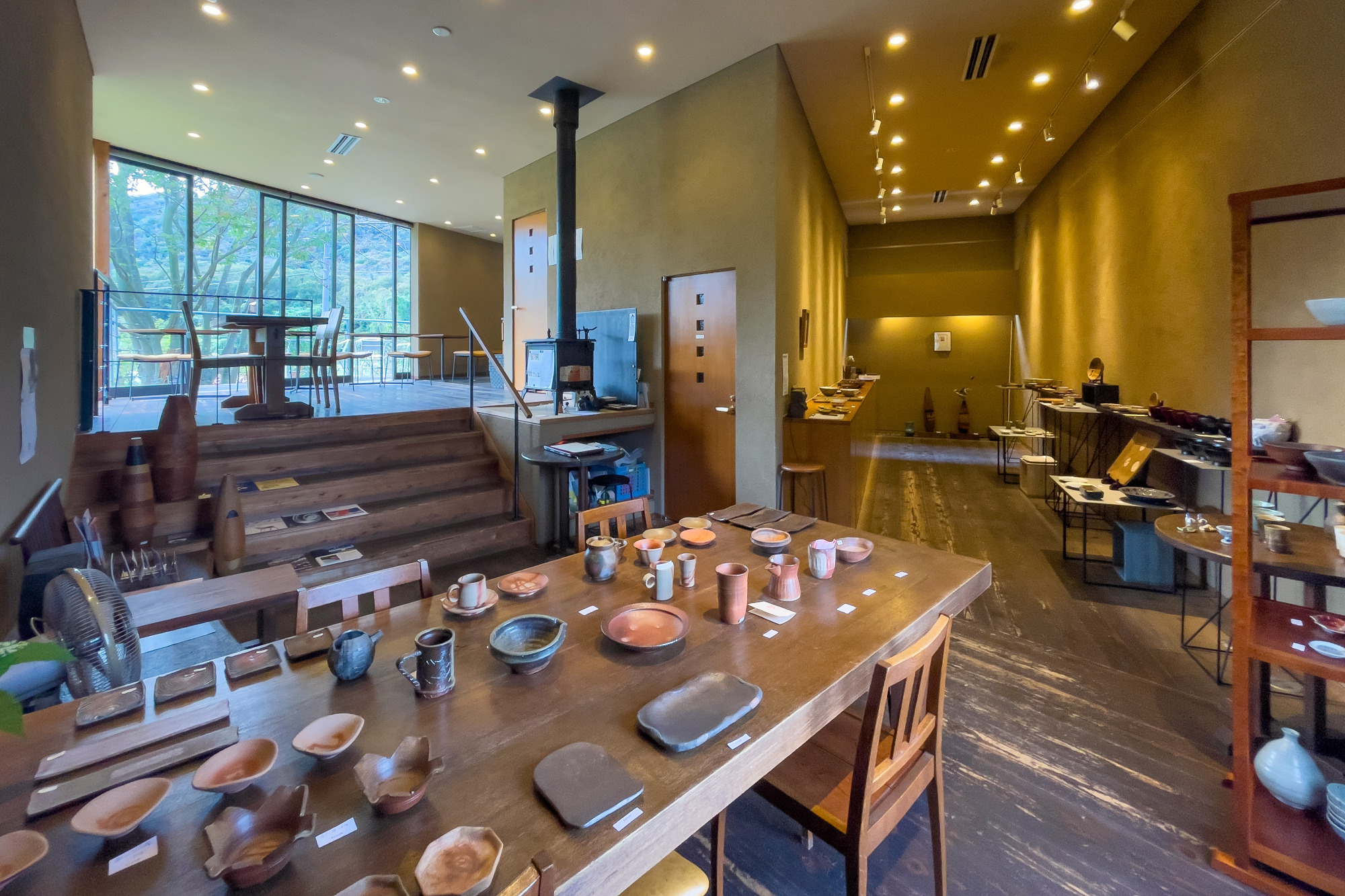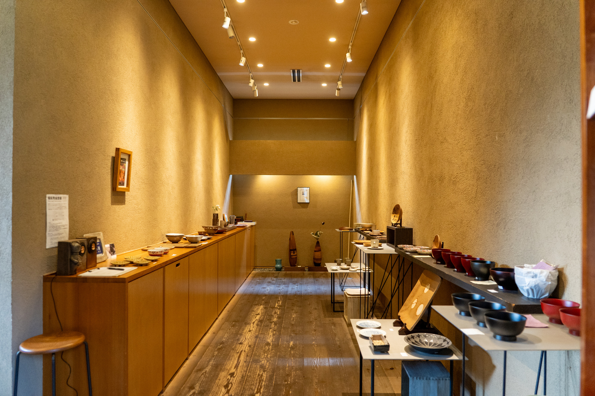 食事スペースから階段を数段降りた先にあるのは、半地下のギャラリー。備前焼をはじめとする陶芸やガラス、木工、染色などの作家の個展が毎月開催されています。注文した蕎麦の提供を待つ間、作り手の温もりが感じられる作品を眺めながら過ごすのも一興です。