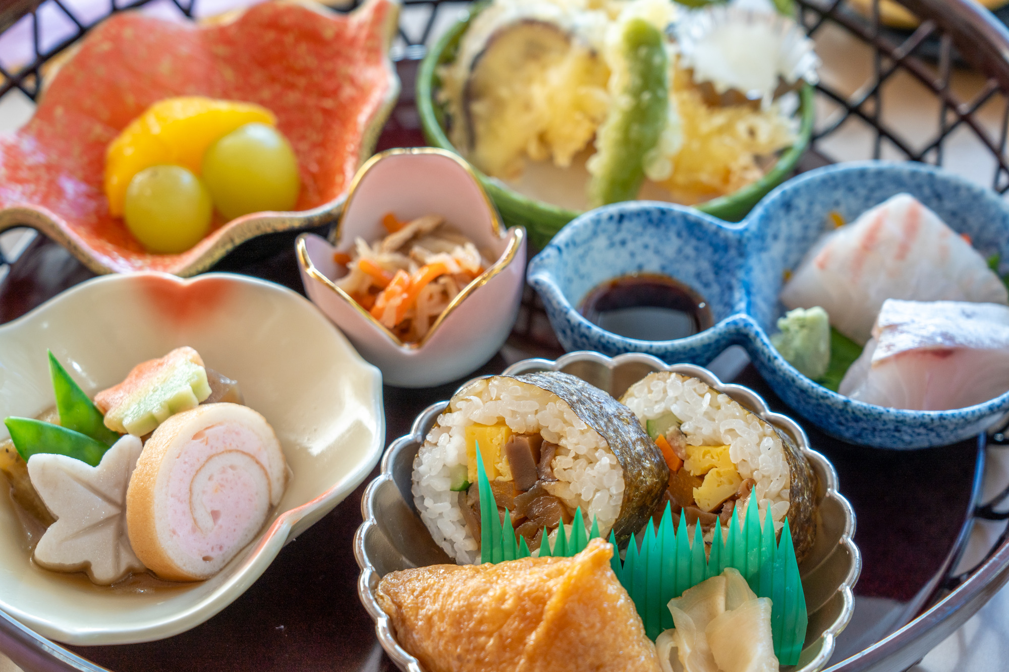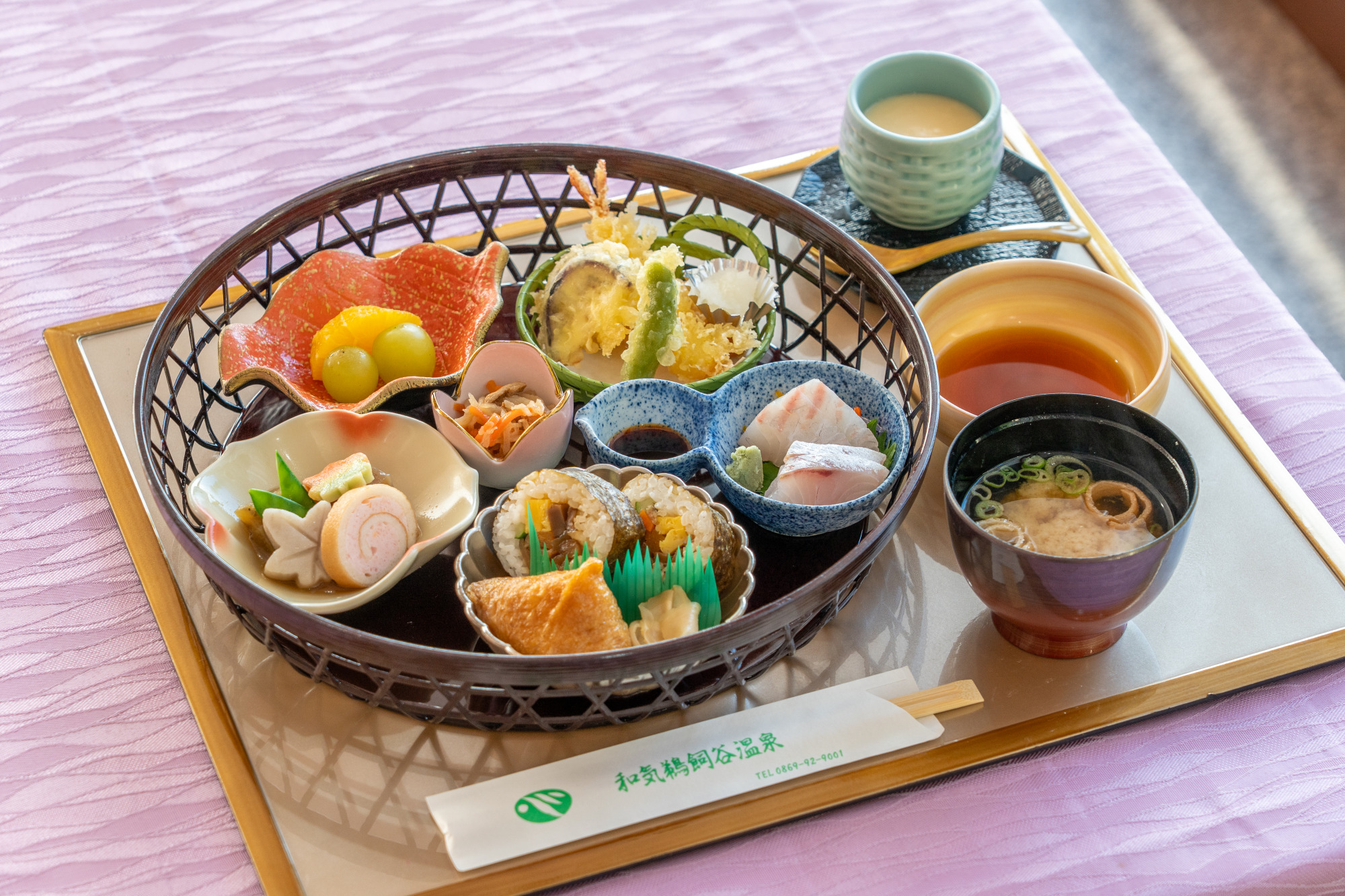 JR和気駅から車で約5分、山陽自動車道和気ICから約10分の場所にある温泉施設「和気鵜飼谷温泉」内のレストラン。「なごみ膳」(1,480円)は、籠の中に彩りあざやかな6皿が入ったランチタイムの人気メニューです。地元の朝日米を使った寿司(いなり寿司・助六寿司)、地元市場から仕入れる鮮魚の刺身、野菜や練り物の炊き合わせ、天ぷら、小鉢、フルーツなど、満足感ある内容。上品な味わいの茶わん蒸しや味噌汁も付いていて、老若男女問わず人気が高いのも頷けます。