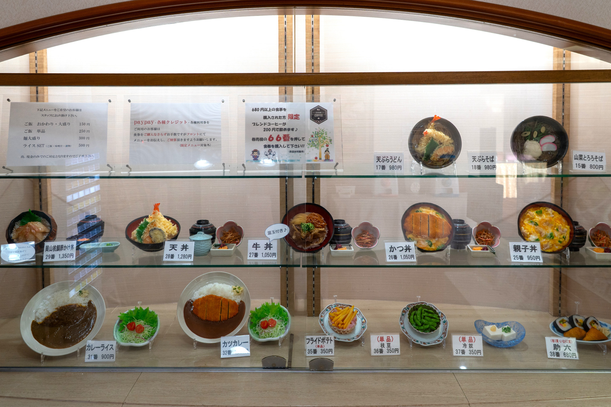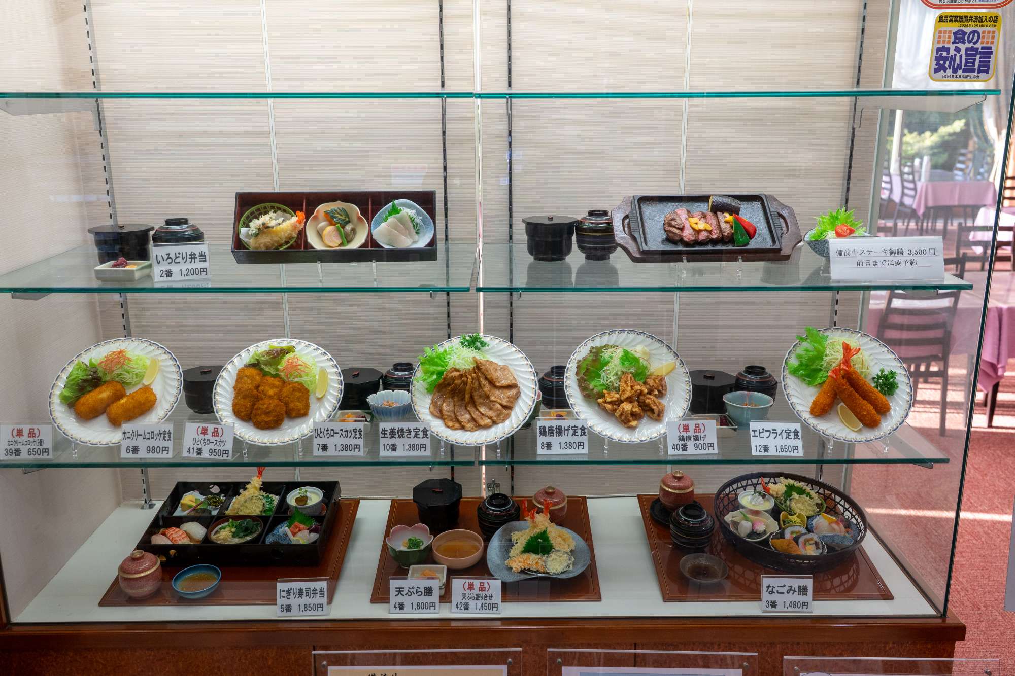 こちらのレストランは、入口にあるショーケースでメニューを確認し、券売機で食券を購入するスタイルです。和食の御膳をはじめ、親子丼や天丼、かつ丼などの丼もの、うどん、そばといった麺類、エビフライやカニクリームコロッケ、生姜焼きなどの定食、さらに備前牛のステーキ(前日までに要予約)やローストビーフ丼など、子どもから大人まで楽しめるメニューが20種類以上。サイドメニューやデザート、ドリンクもあるので、食後のひとときも楽しめます。