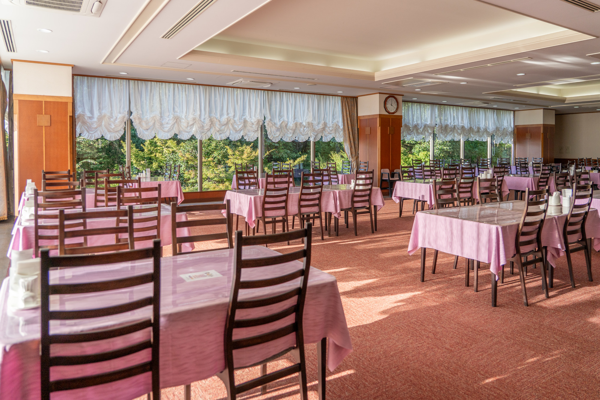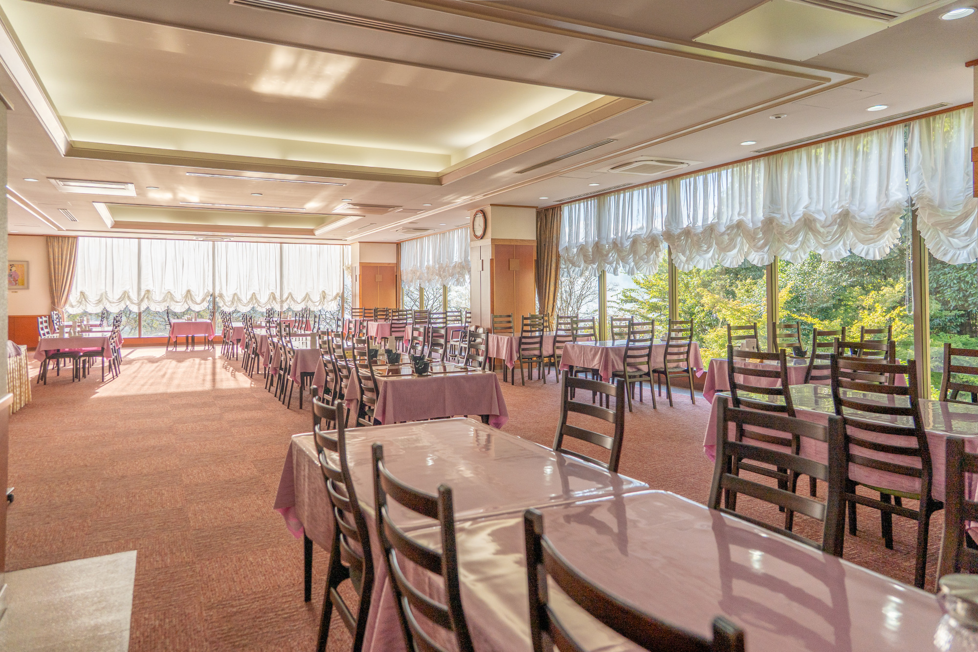 2面に大きな窓がある広々とした店内には、テーブルがゆったりと配置されています。窓際の席に座れば滝のある日本庭園や、春には吉井川沿いの桜も望むことができます。土・日曜日には関西圏から訪れる人も多く、開店前から行列ができるほどの人気。日帰り温泉入浴の前後に食事をする人だけでなく、お子さまメニュー(500円)もあるので、すぐ近くの「わけまろパーク」に遊びに来た子ども連れの家族の利用も増えているそう。