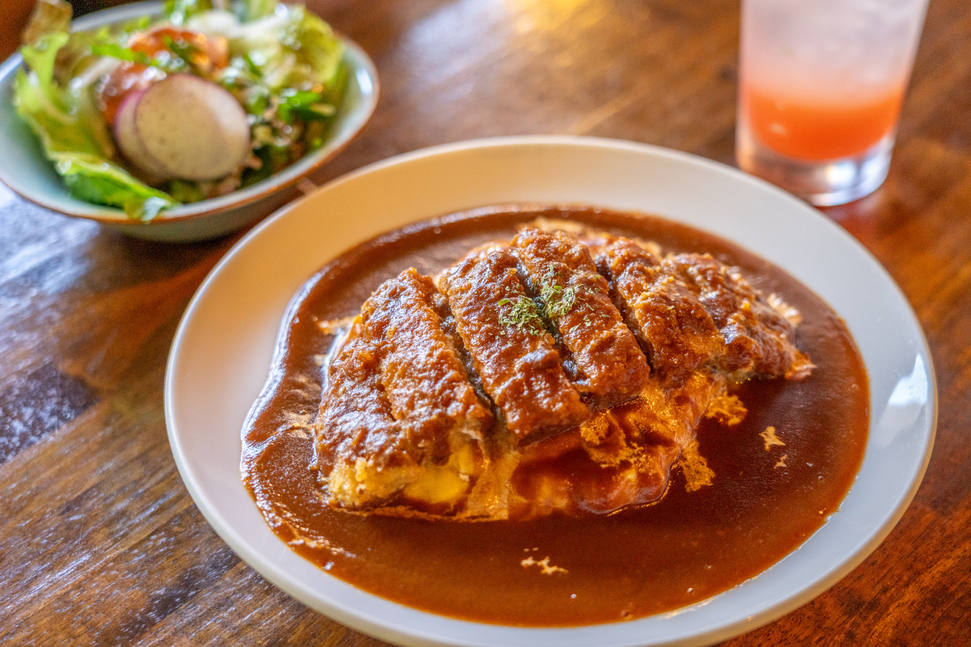 「オムライスの店」というだけあって、迷ってしまうほどの種類豊富なオムライスラインナップ。卵ふわとろ系のオムライスは、デミグラス、トマト、ホワイトとすべて手作りのソースに具材やトッピングの組み合わせで常時15種類以上が楽しめます。ビビンバ風の石焼きオムライスなどの変わり種や、カキフライや豚かば、カポナータといった季節限定メニューもあり、何度訪れても飽きさせません。写真は「デミカツオムライス(並)」(1,300円)。プラス550円で日替わりサラダと20種類以上から選べるドリンクをセットにできます。