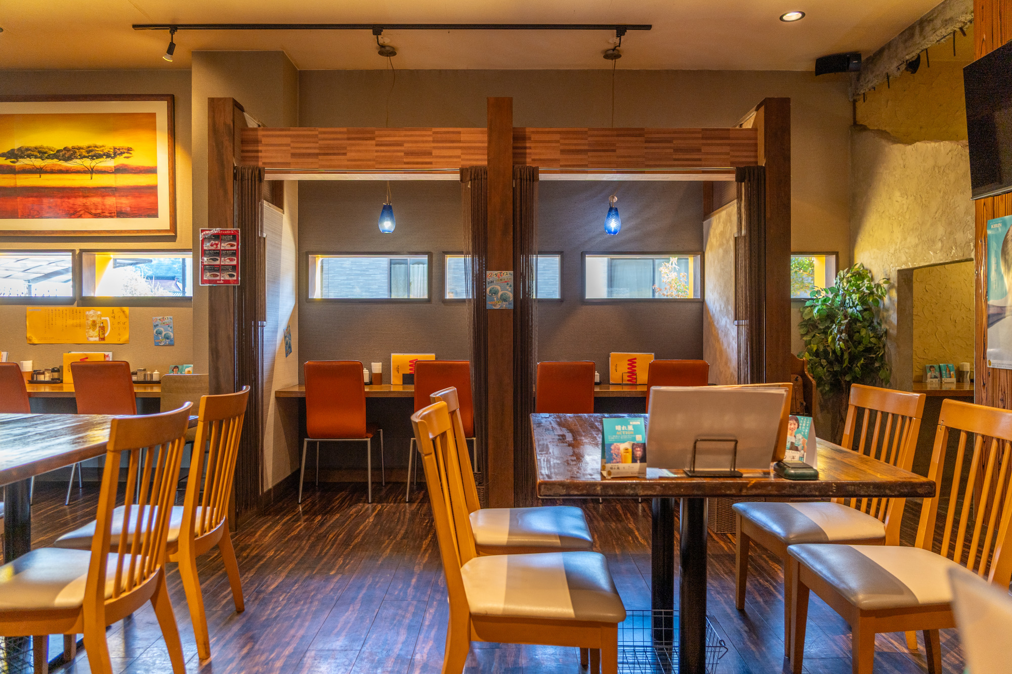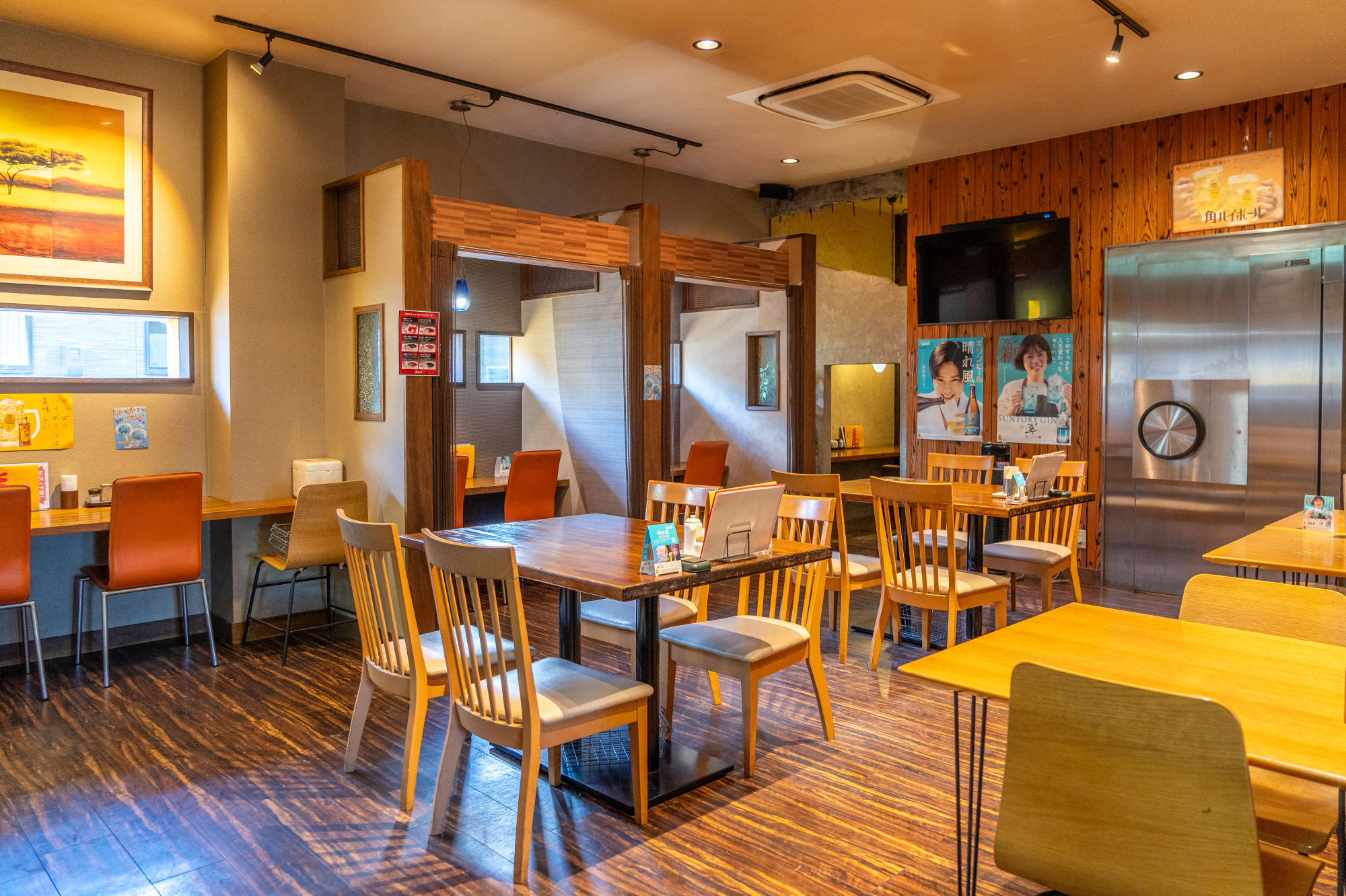 テーブル、カウンター、掘りごたつのほか、隠れ部屋のようなカップル席もあり、おひとりさまからグループ、子ども連れの家族など、幅広いシーンで使えます。オムライス以外にもからあげやチキン南蛮、焼肉、さらにはお刺身の定食、丼もの、アラカルトなどメニューも豊富なので、子どもから大人まで揃った3世代での利用にも便利。