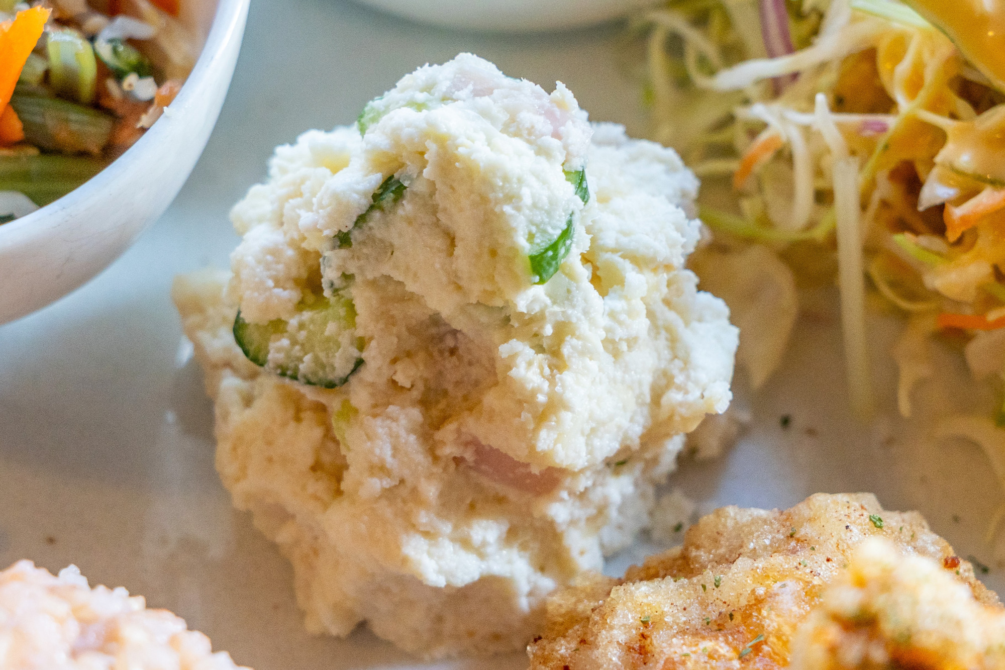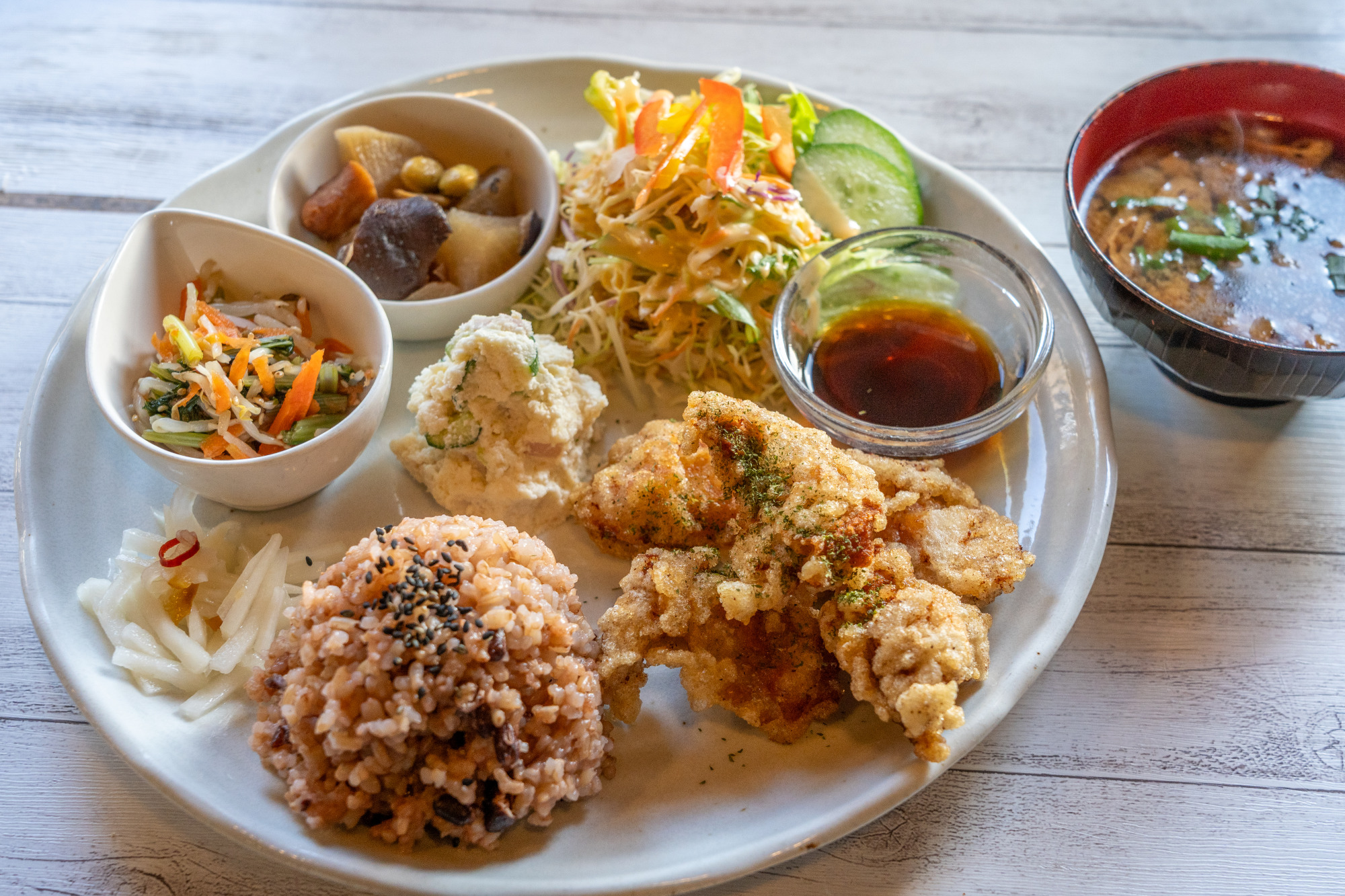 初心者から上級者まで登山が楽しめると近年人気の和気アルプス。「cafe gouter」はその山の麓に佇む母娘で営むカフェ。こちらで楽しめるランチは、ハンバーグや焼き魚、とんかつなどの定食をはじめ、カレーやドリア、鶏肉ときのこの和風パスタやシーフード明太クリームパスタ、揚げナスのミートソースパスタなどのパスタに自家製生地のピザなど多彩。なかでも「本日のLUNCH」(1,000円)は日替わりでメインのおかずが変わり、旬の食材を使った副菜や野菜サラダ、漬物に味噌汁(スープに変更可)も付いた充実の内容です。この日は丁寧に下味を付け、片栗粉で揚げたサクサク衣のからあげ。ポン酢にもよく合います。