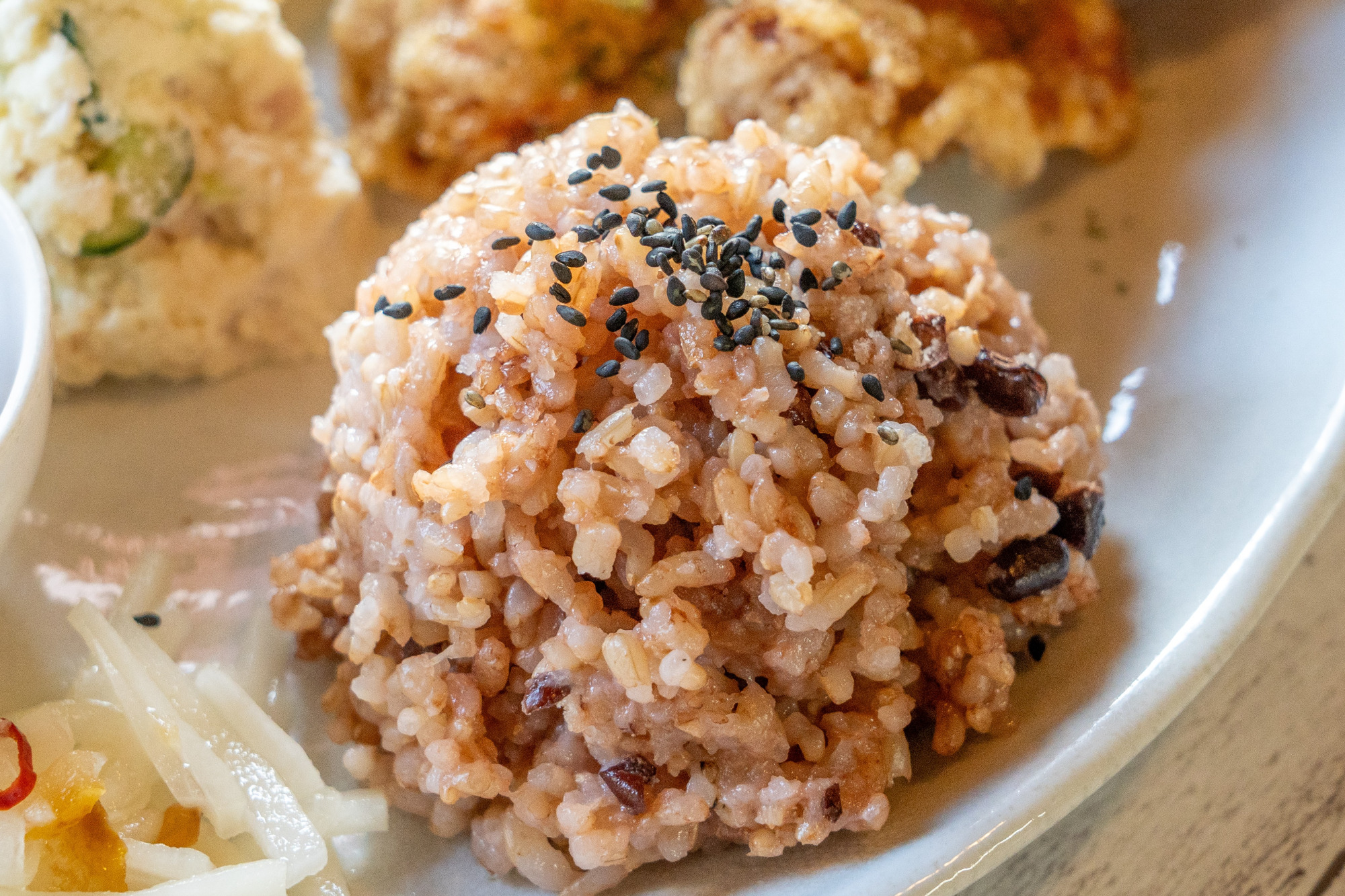 ヘルシーな献立も魅力。玄米を小豆と塩と一緒に炊いて数日熟成させた酵素玄米ごはんは、ほんのりとした甘さと芳ばしさが特徴で、その味わいともっちりとした食感のクセになる人が続出。ランチでは酵素玄米か地元産のお米を使った白ごはんから選べます。マヨネーズとフレンチドレッシングで味付けしたおからサラダもファンの多いひと品。和え物や煮物、炒め物など、その他の副菜も自家栽培や親戚が作る旬の野菜がふんだんに使われており、季節を感じられるプレートとなっています。日替わりのパスタや、小学生以下限定の「お子様ランチ」(650円)もあり。